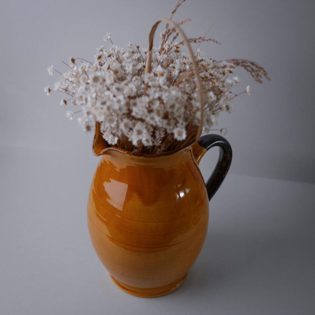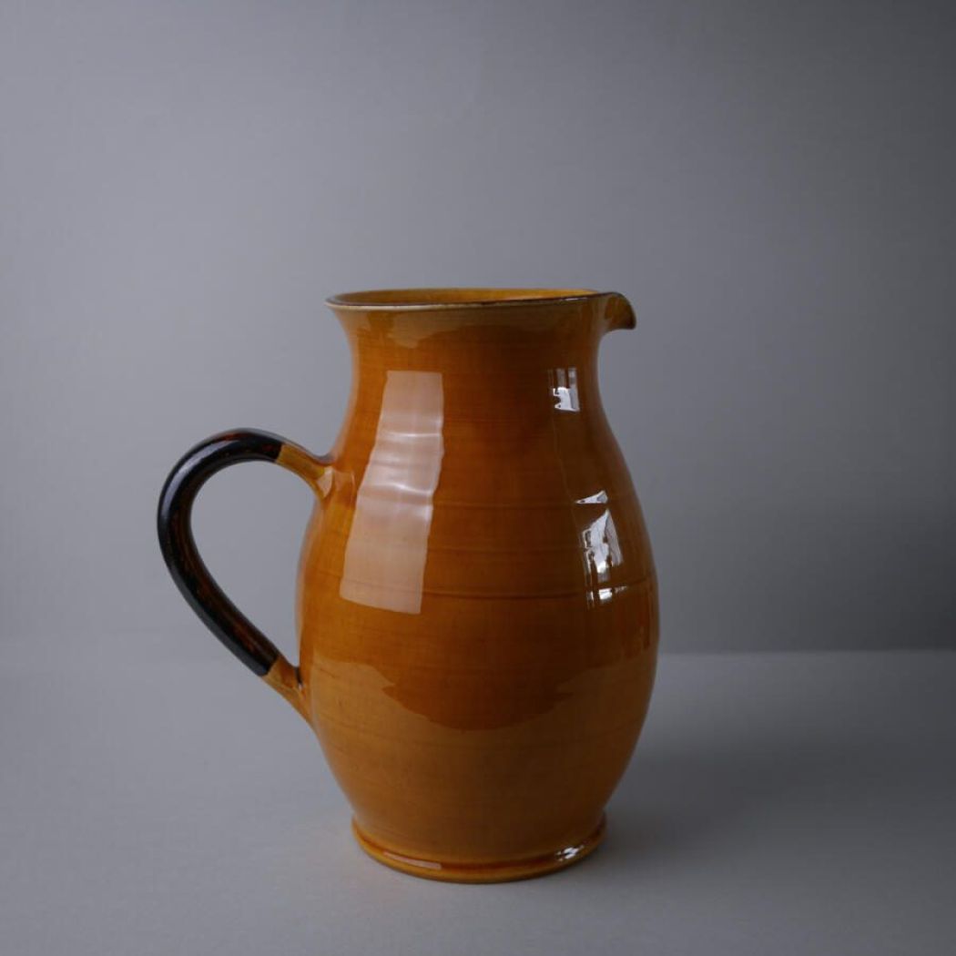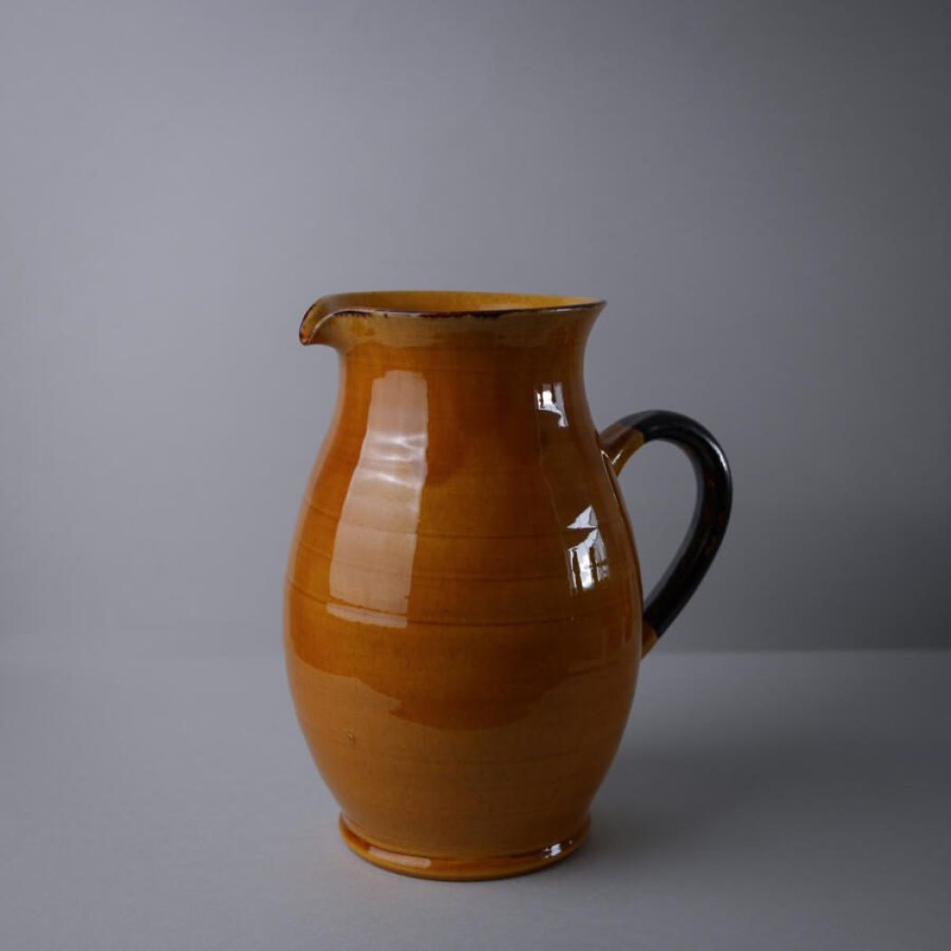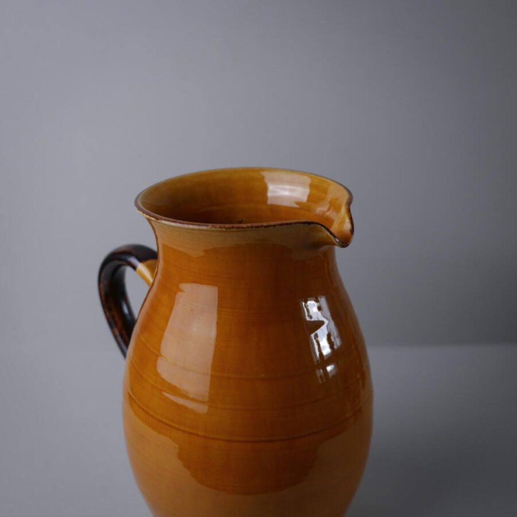 En utrolig flot og meget stor orange fransk kande i keramik med brun hank. Kanden er oplagt til dekoration med tørrede blomster eller grene. Kanden er et fund fra Sverige.