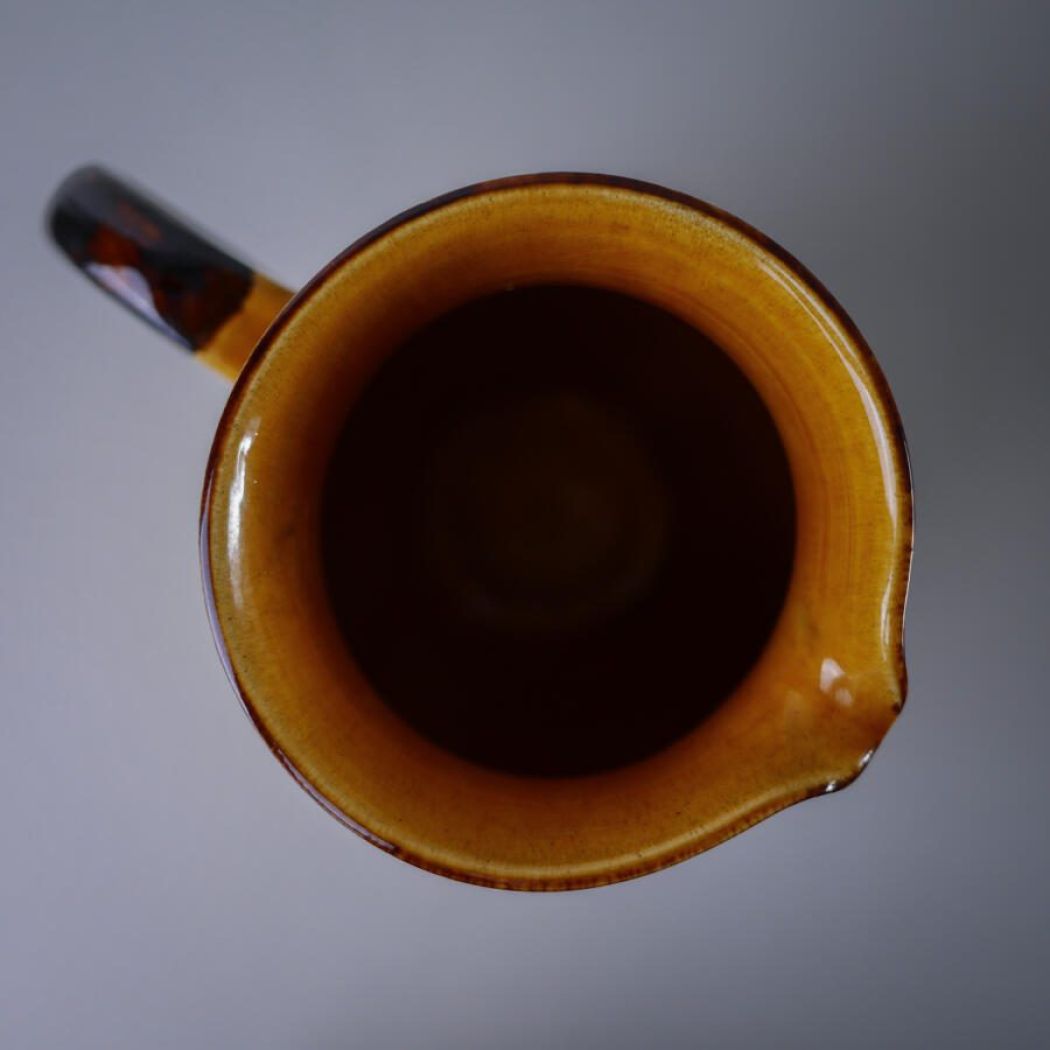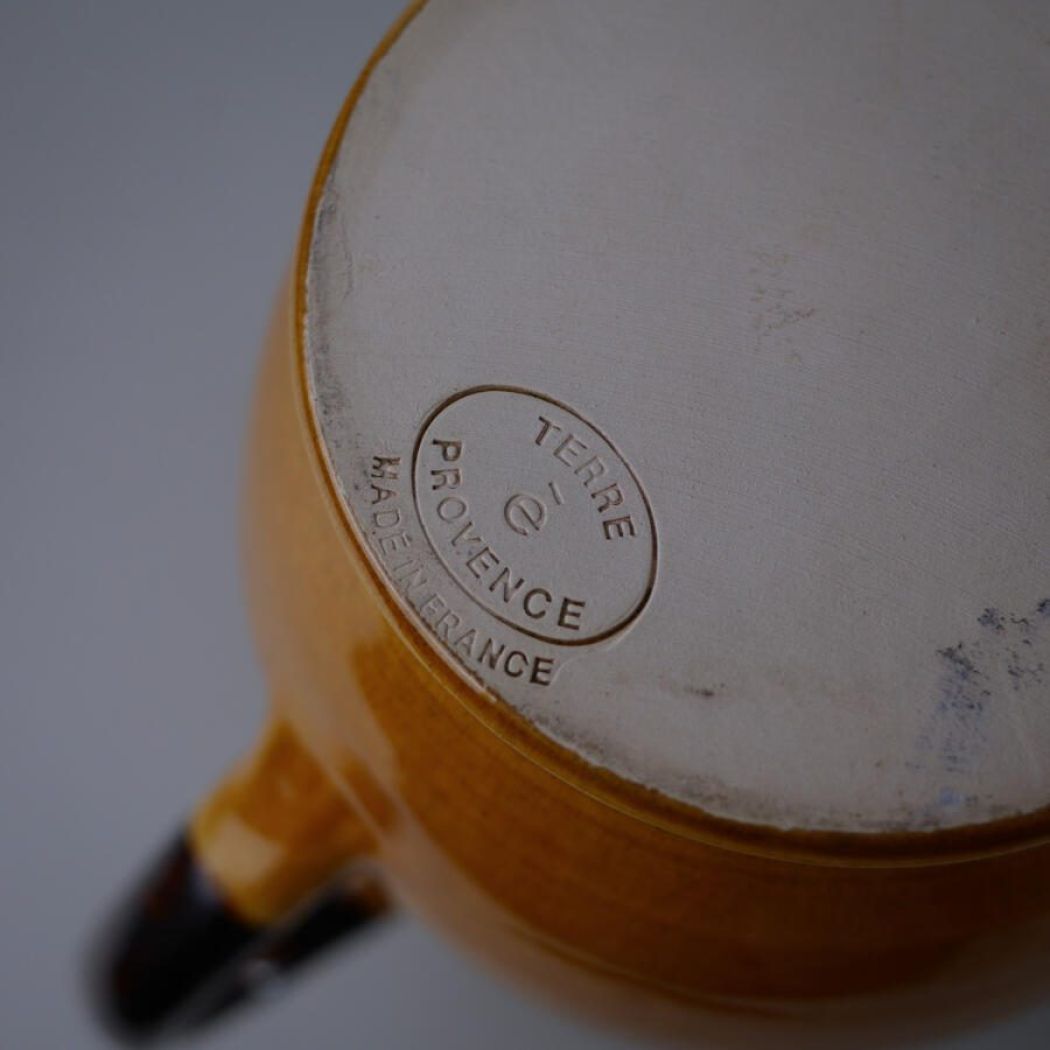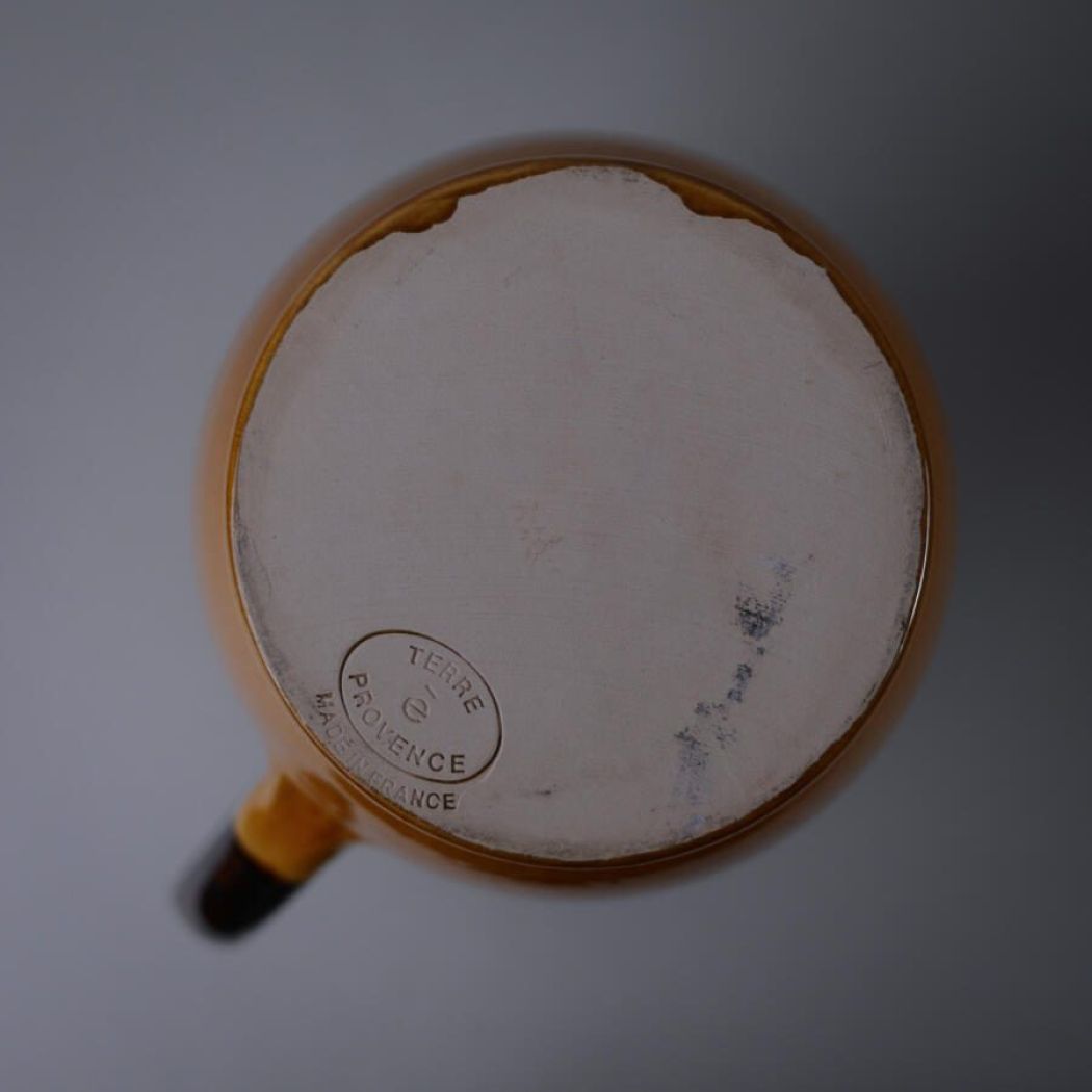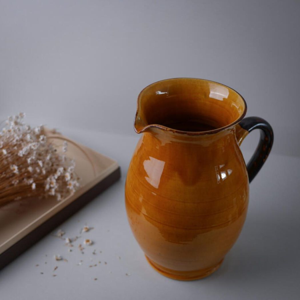 En utrolig flot og meget stor orange fransk kande i keramik med brun hank. Kanden er oplagt til dekoration med tørrede blomster eller grene. Kanden er et fund fra Sverige.