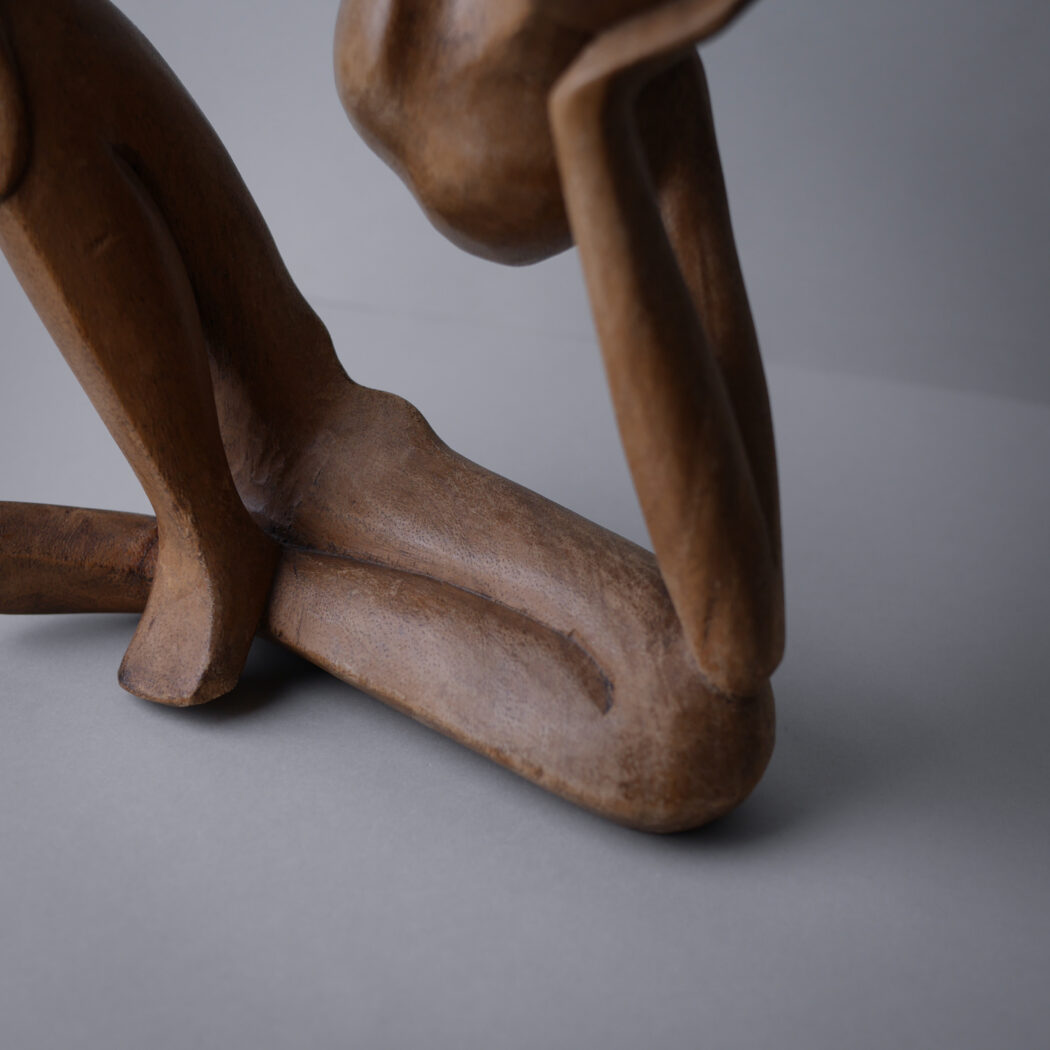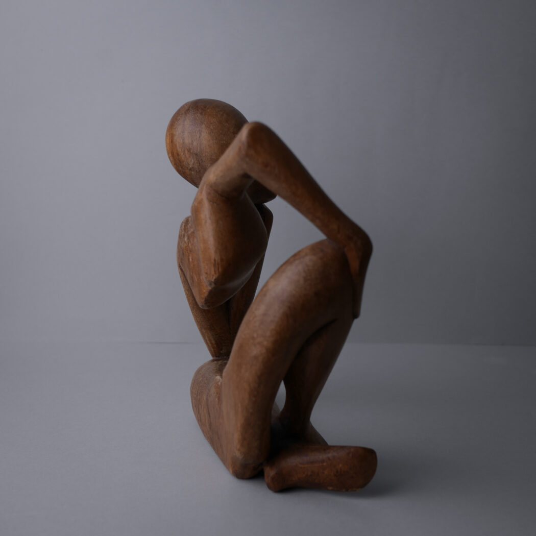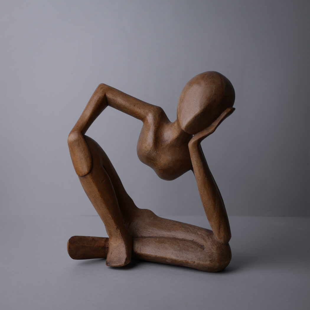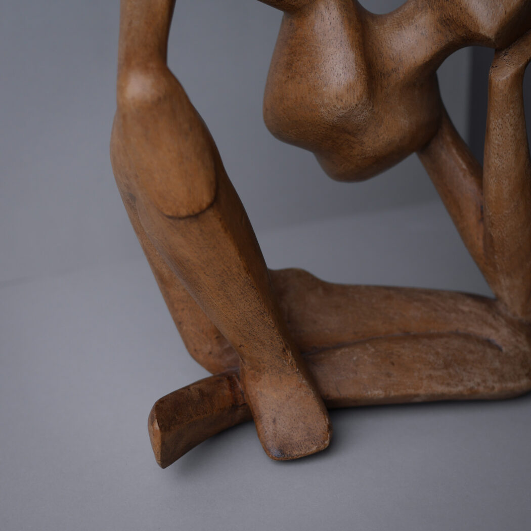 En fantastisk flot stor træfigur – tænkeren. Helt utrolig smuk i en indretning eller som en del af et stilleben. Træ er uundgåeligt i den moderne indretning, og en figur den perfekt måde at integrere det på. Foden er limet, men det ses stor set ikke, se detaljefotos.