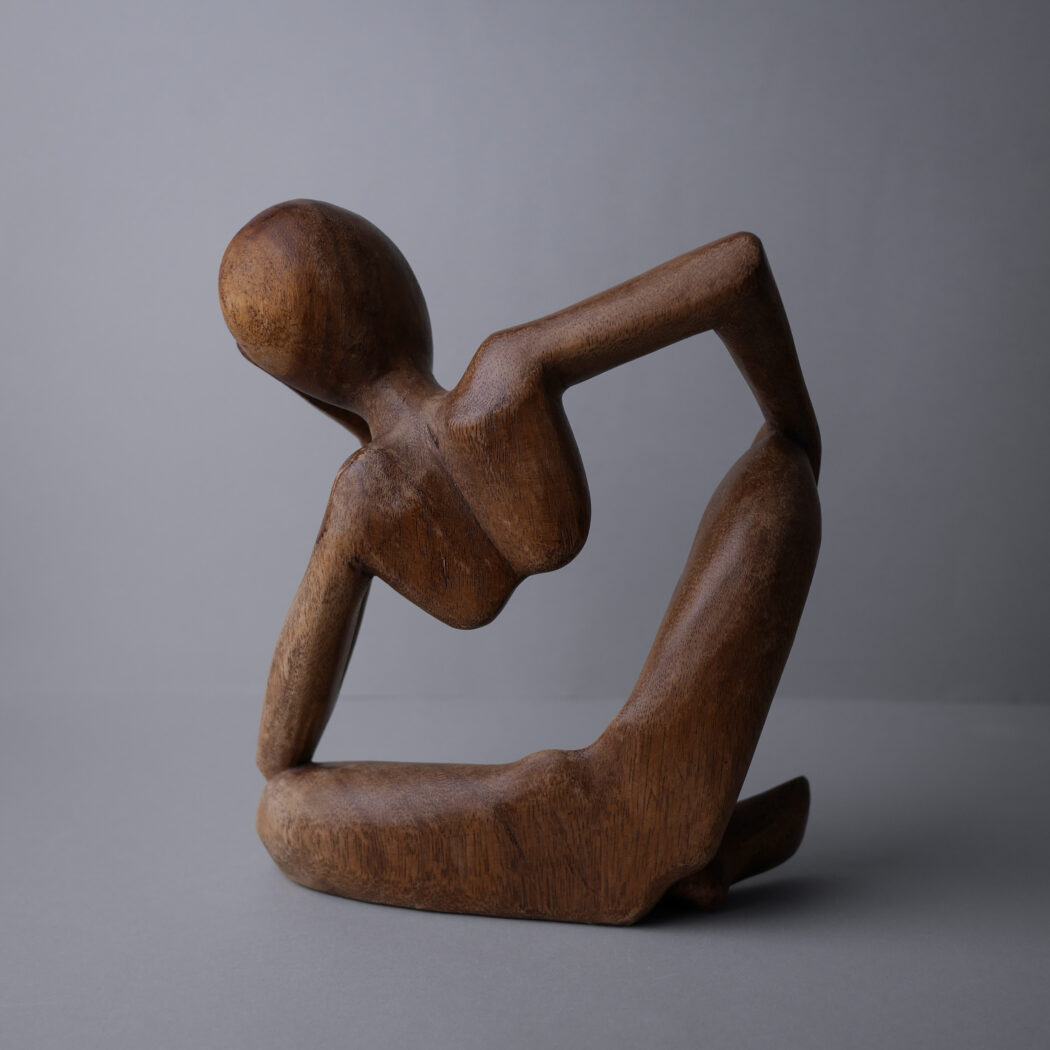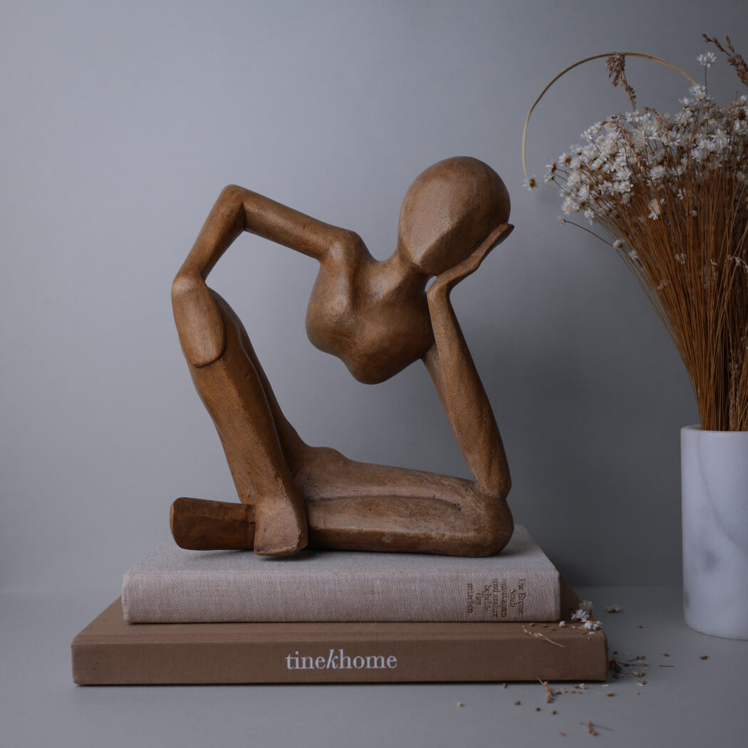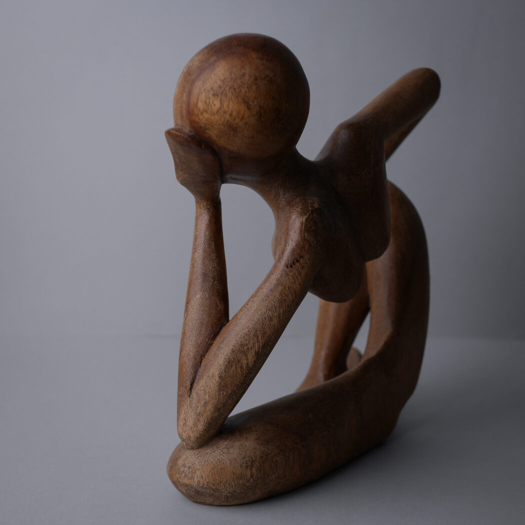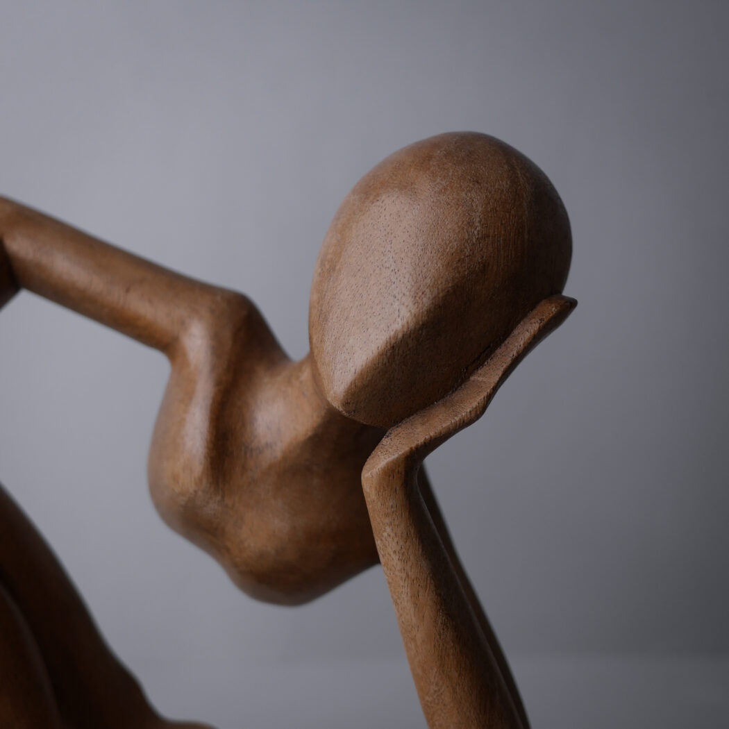En fantastisk flot stor træfigur – tænkeren. Helt utrolig smuk i en indretning eller som en del af et stilleben. Træ er uundgåeligt i den moderne indretning, og en figur den perfekt måde at integrere det på. Foden er limet, men det ses stor set ikke, se detaljefotos.