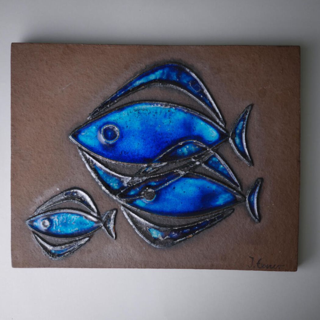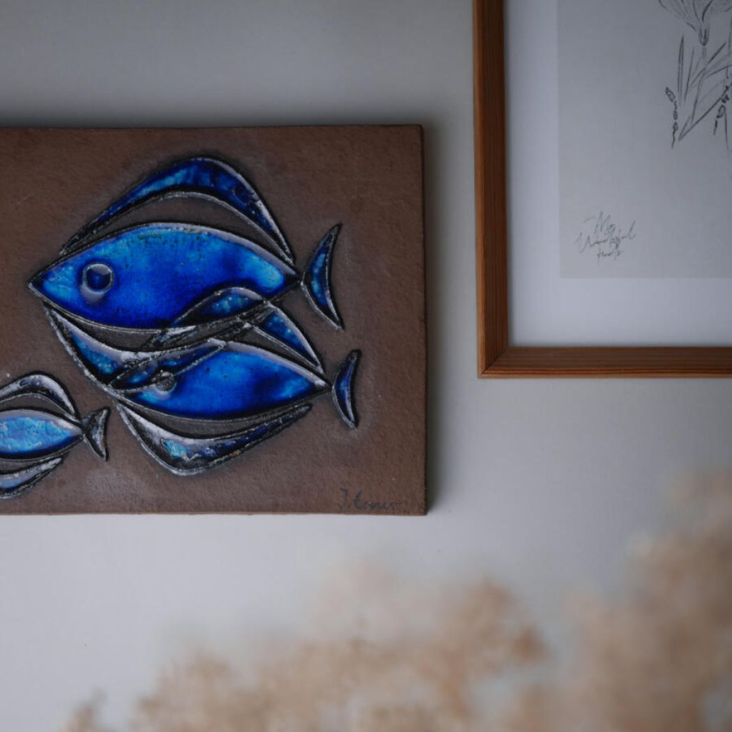 Et super cool stort brunt keramikrelief med flotte blå fisk. Et unika keramikfund, som grundet dets store størrelse vil være flot udenfor på husmuren – “vi bor i huset med fiskene”, så skønt! Et fund fra Sverige.