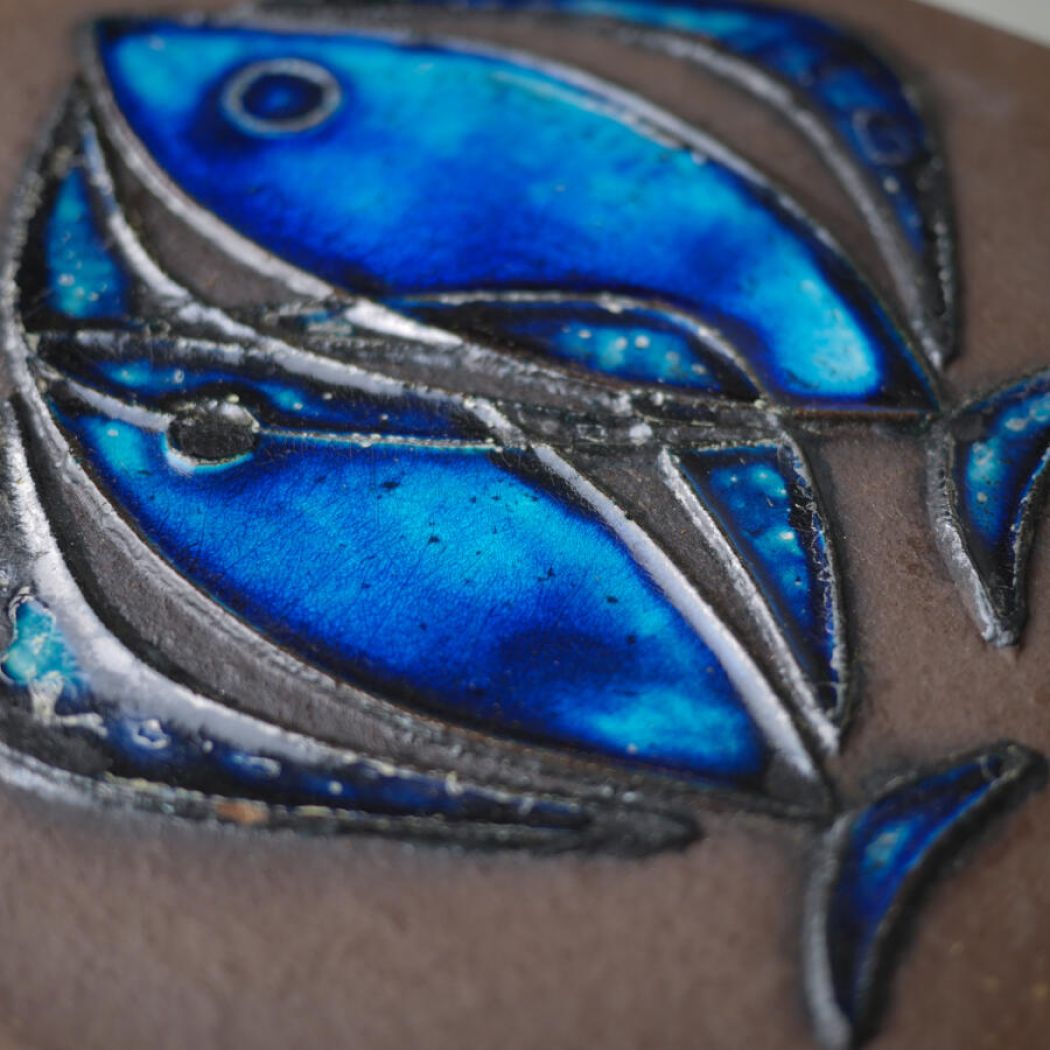 Stort Brunt Keramikrelief med Blå Fisk