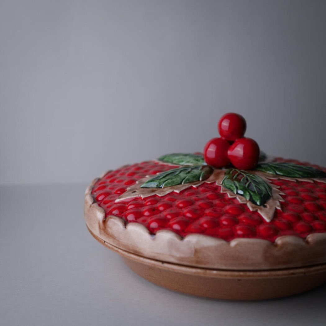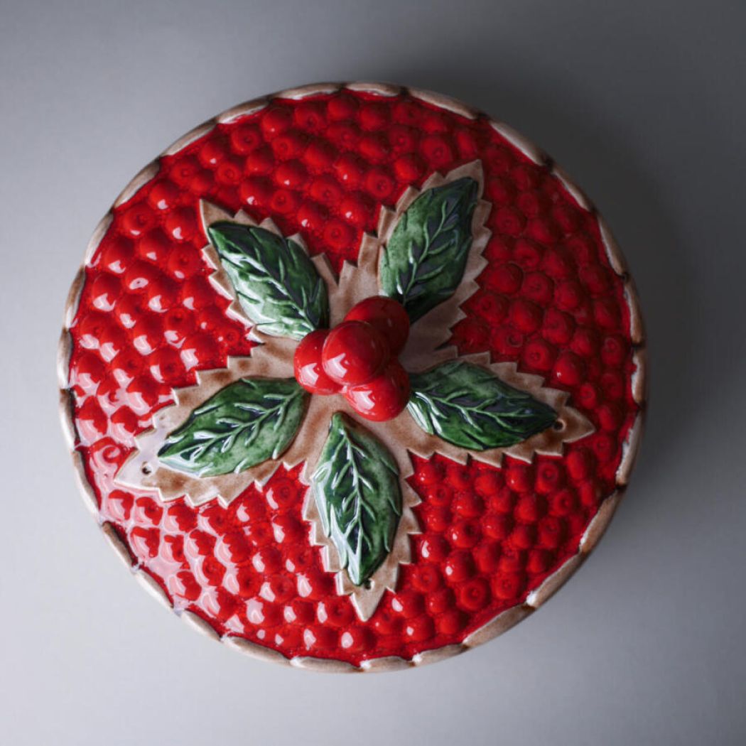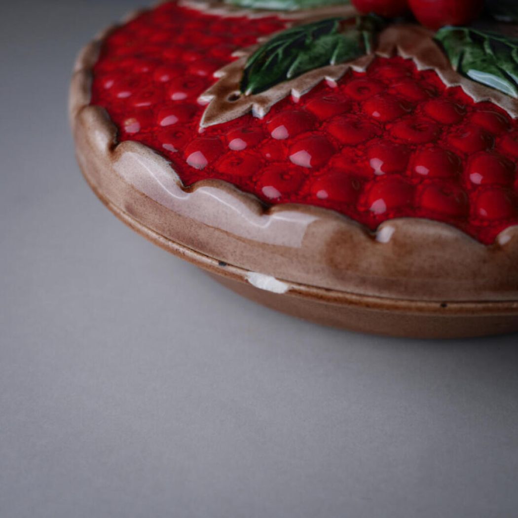 Et flot stort rødt jordbærtærtefad. Simpelthen så skønt og overdynget med røde bær og flotte grønne blade. Dette tærtefad har desværre en revne nede i – det er ikke utæt, men jeg ville ikke anbefale at bage tærter i det, men udelukkende bruge det, som dekoration i køkkenet. Et nag på siden, se detaljefotos. Pris sat derefter. Et dekorativt fad fra Sverige.