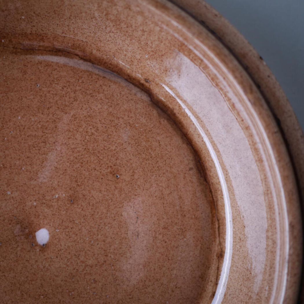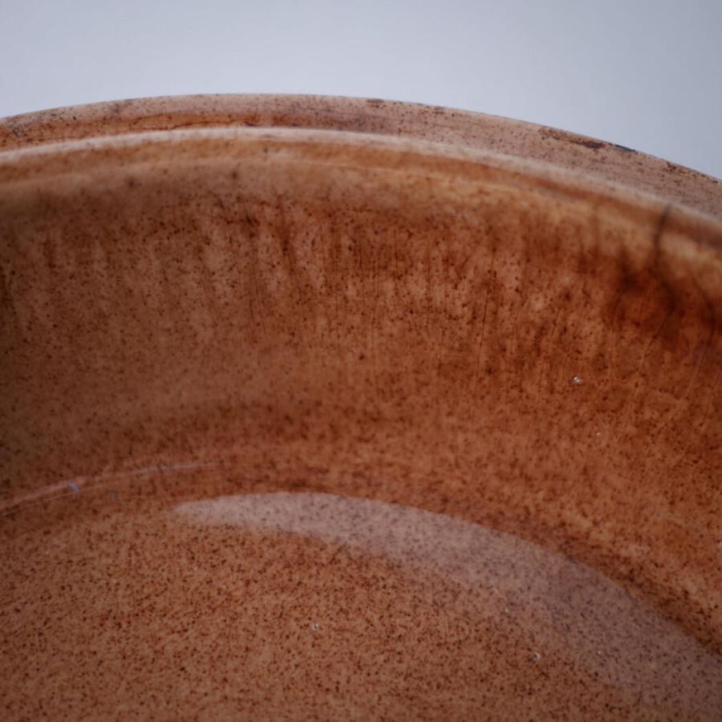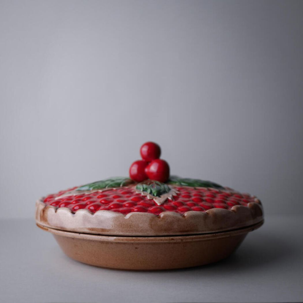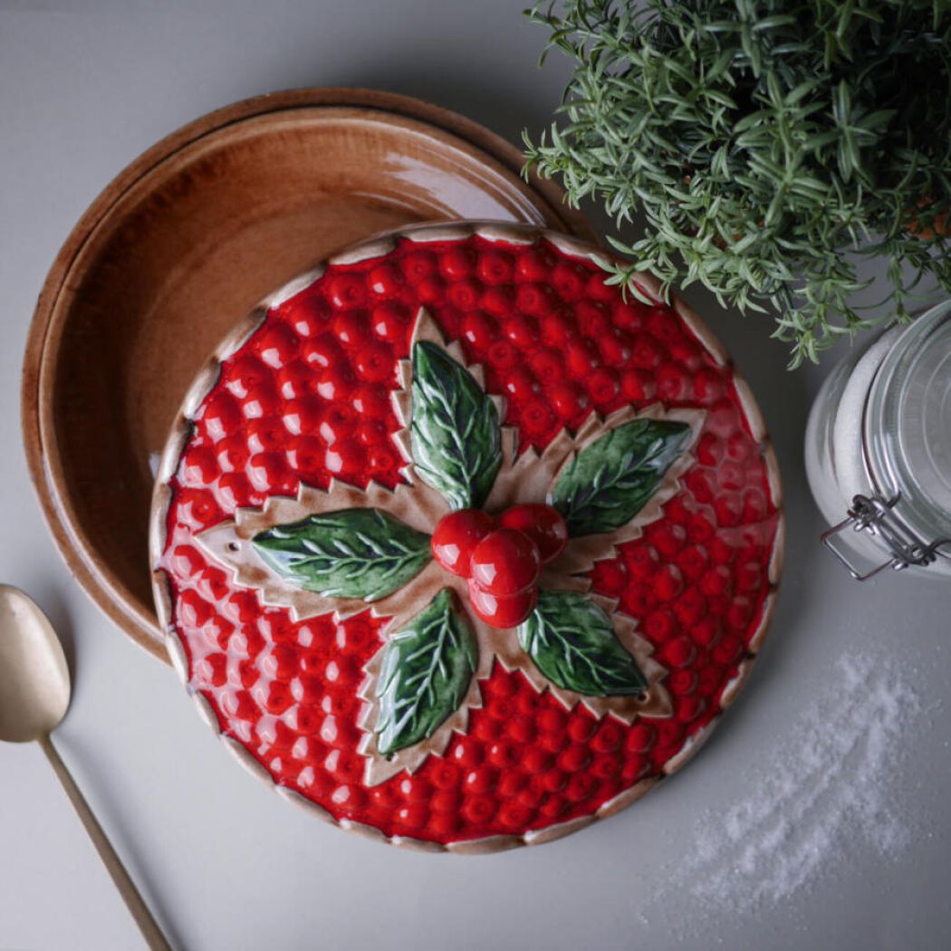 Et flot stort rødt jordbærtærtefad. Simpelthen så skønt og overdynget med røde bær og flotte grønne blade. Dette tærtefad har desværre en revne nede i – det er ikke utæt, men jeg ville ikke anbefale at bage tærter i det, men udelukkende bruge det, som dekoration i køkkenet. Et nag på siden, se detaljefotos. Pris sat derefter. Et dekorativt fad fra Sverige.