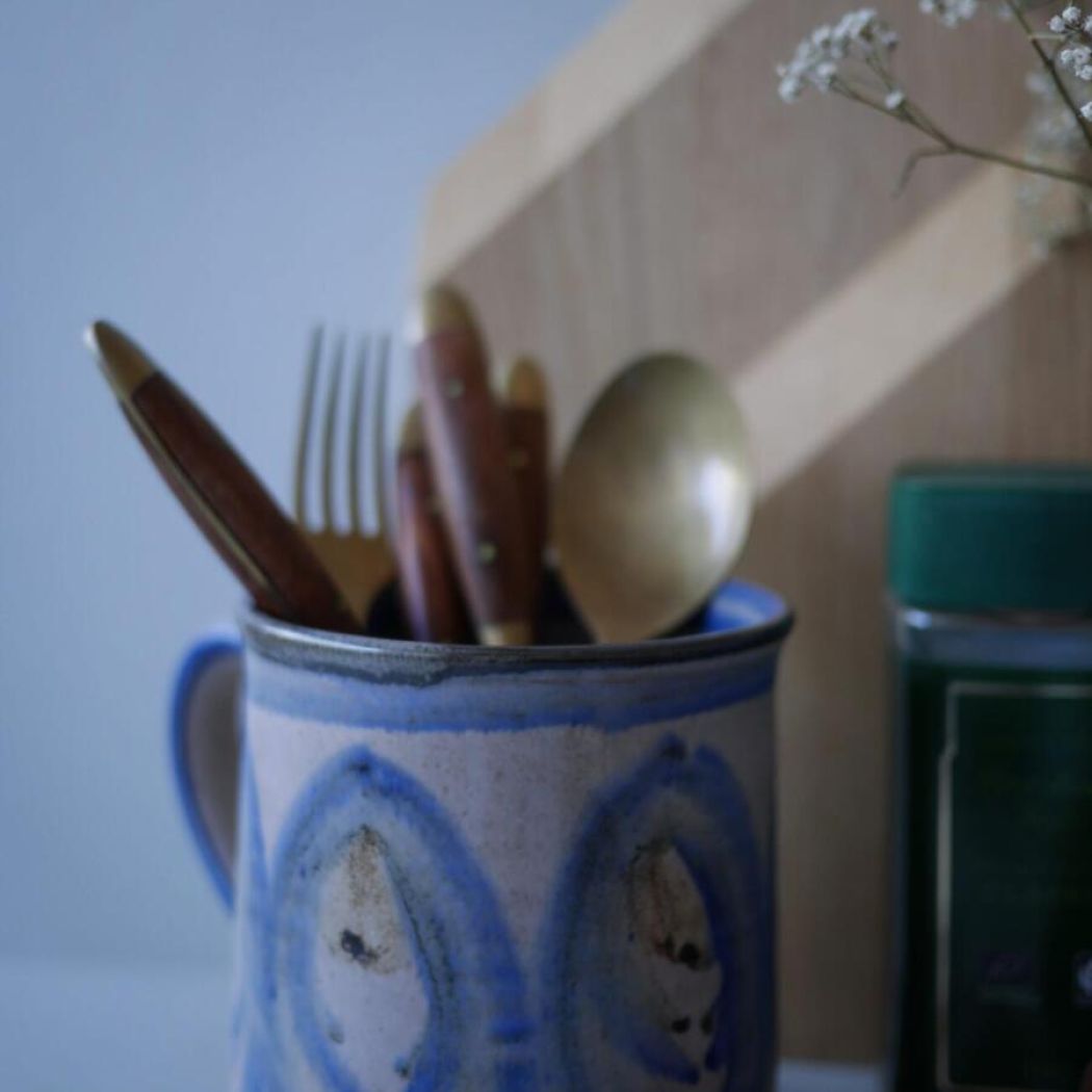 Endnu et smukt stort keramikkrus perfekt til at opbevare bestik eller skriveredskaber i. Kruset er utrolig flot i farverne og med et meget fint mønster. Det vil være super dekorativt i køkkenet, og er det en af de mandage, så kan du jo snuppe en ordentlig spand kaffe.