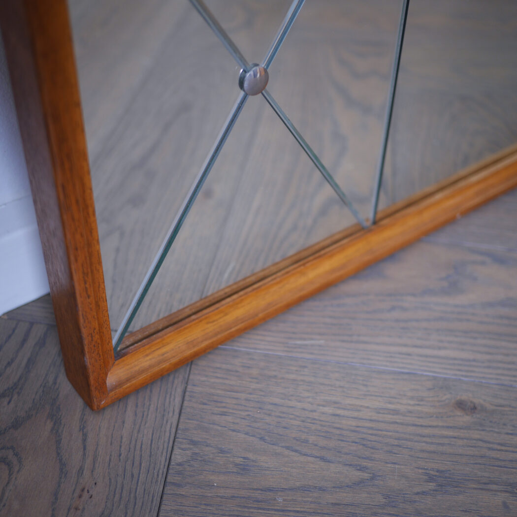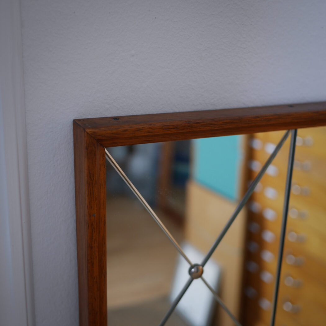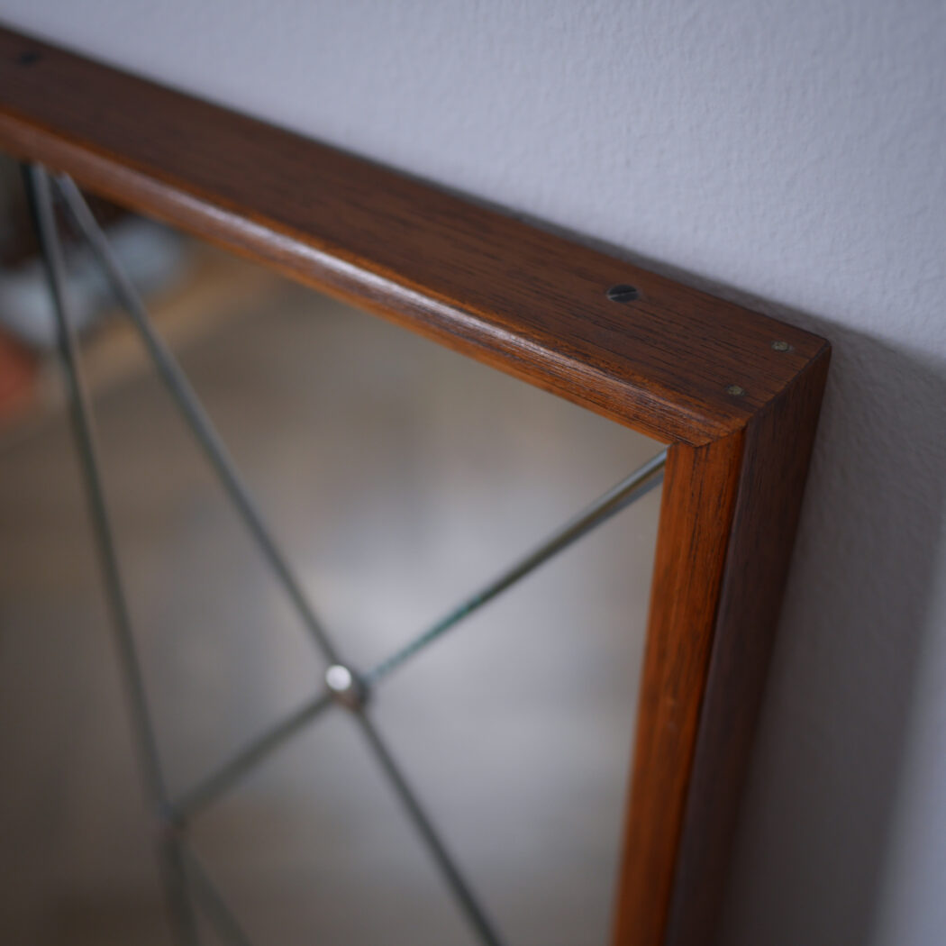 Et über smukt stort spejl i flot mørk træramme. Spejlet har utrolig flotte udskæringer og nitter i glasset, som giver en særlig effekt. Spejlet kan hænge på væggen. Her får du ikke blot et spejl, men en vægdekoration i særklasse. Det er ikke ofte, at jeg falder over så flot et spejl! Det er fundet i Sverige.