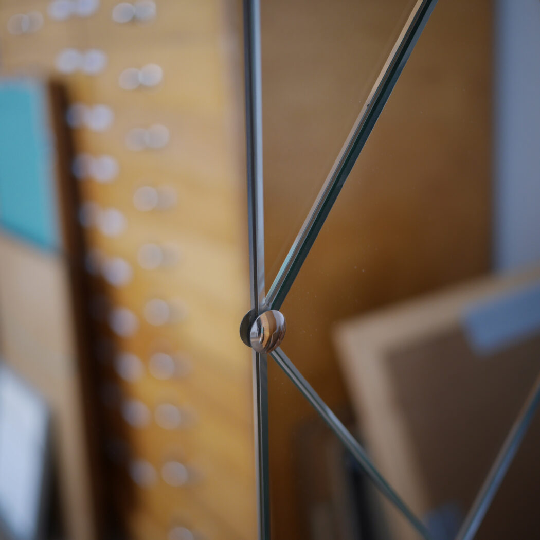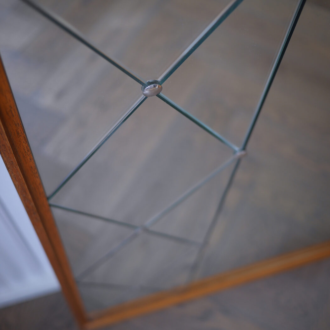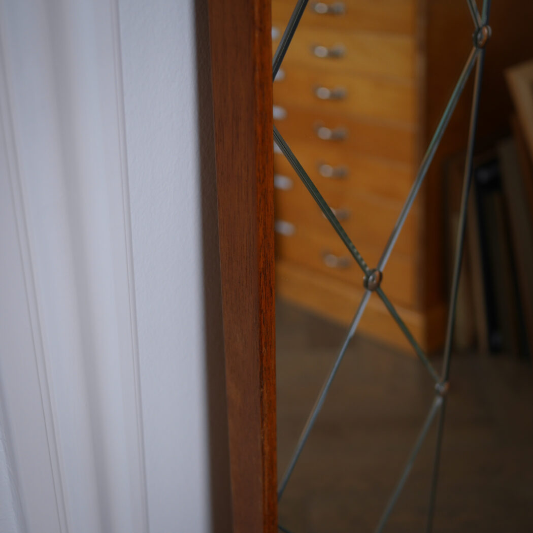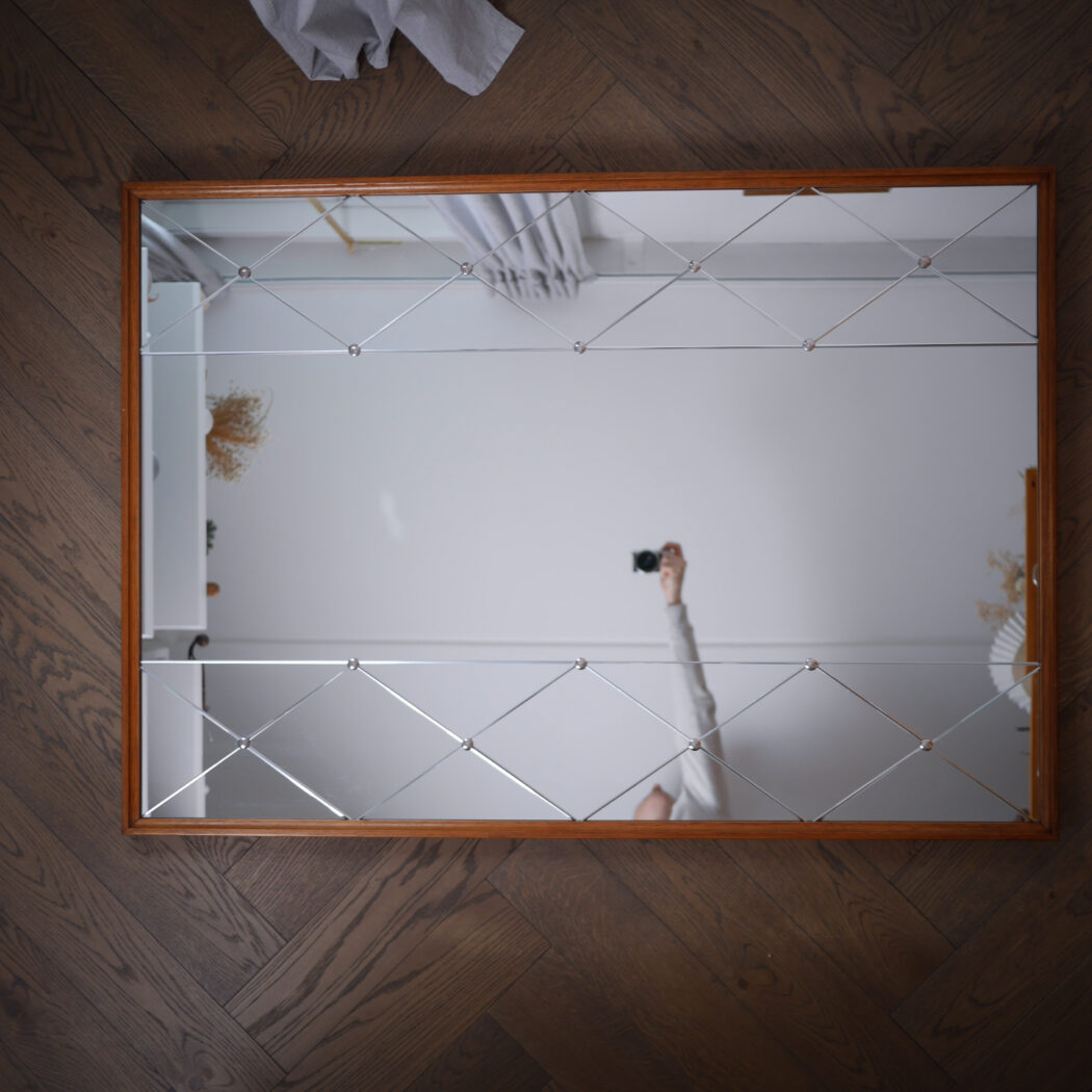 Et über smukt stort spejl i flot mørk træramme. Spejlet har utrolig flotte udskæringer og nitter i glasset, som giver en særlig effekt. Spejlet kan hænge på væggen. Her får du ikke blot et spejl, men en vægdekoration i særklasse. Det er ikke ofte, at jeg falder over så flot et spejl! Det er fundet i Sverige.