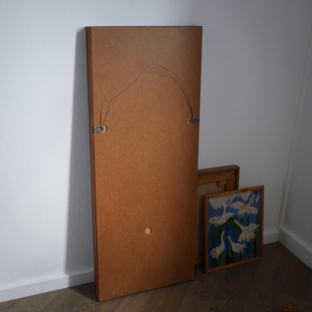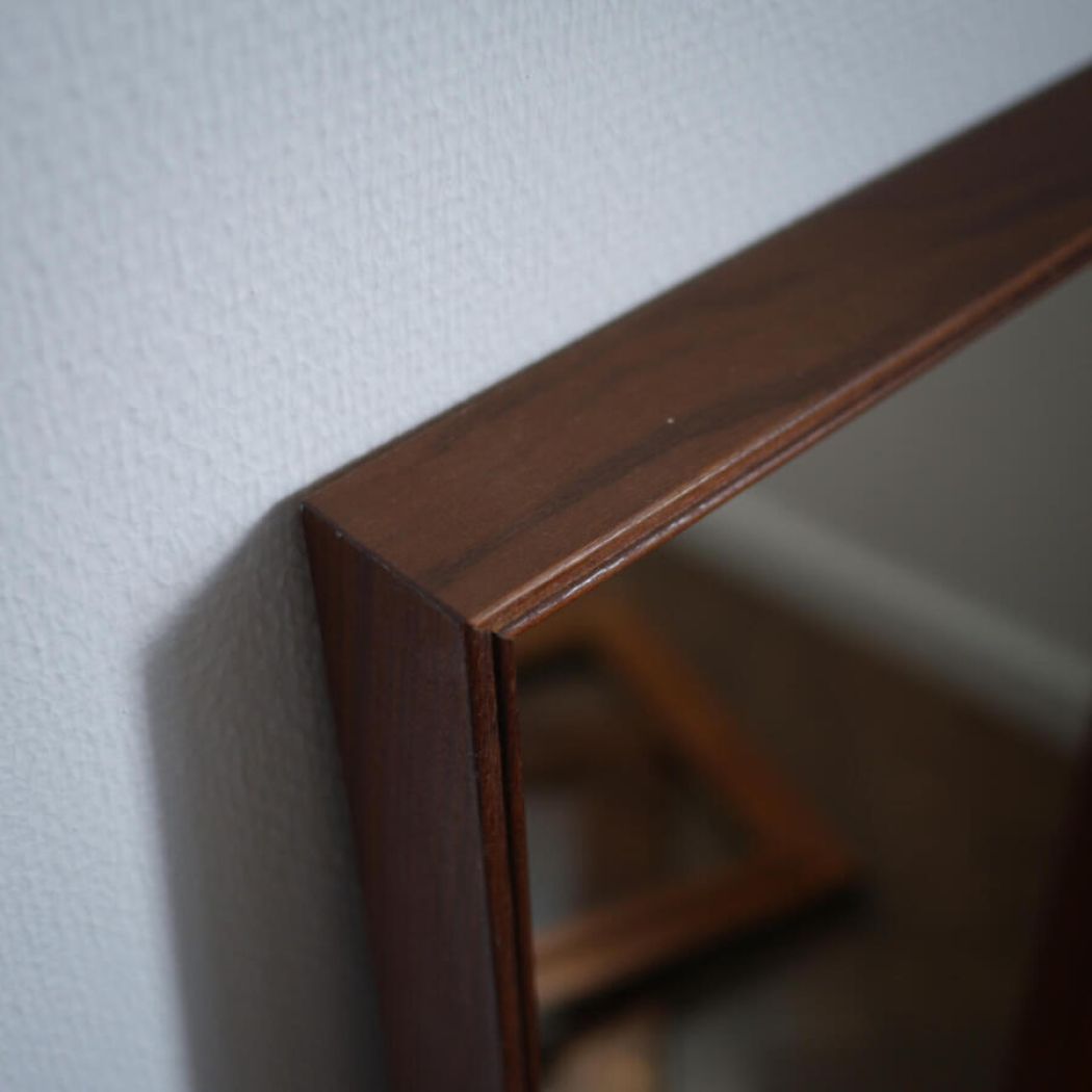 Et meget smukt stort teaktræs spejl fra Sverige. Trækvaliteten er så smuk og med fine detaljer i træet. Et højt aflangt spejl, som passer perfekt ind i den moderne indretning. Spejlet har nogle enkle skrammer på den ene side, se detaljefotos. Spejlet kan afhentes i Solrød Strand eller leveres på Sjælland efter aftale.