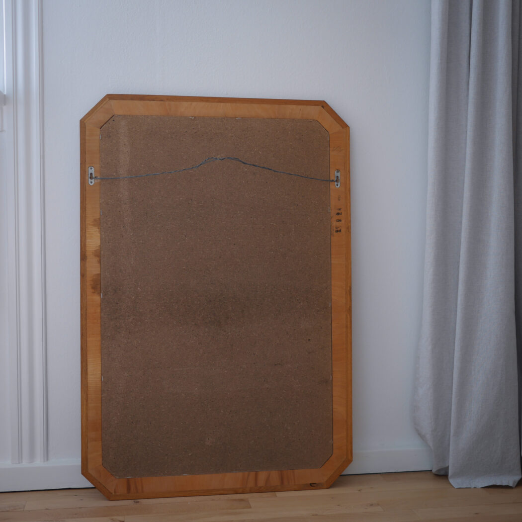 Et stort og meget flot vægspejl i træ med den smukkeste samme, som virkelig træder frem på væggen. Spejlet er fundet i Sverige.
