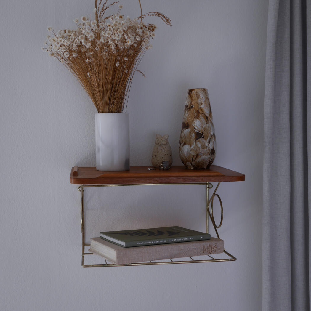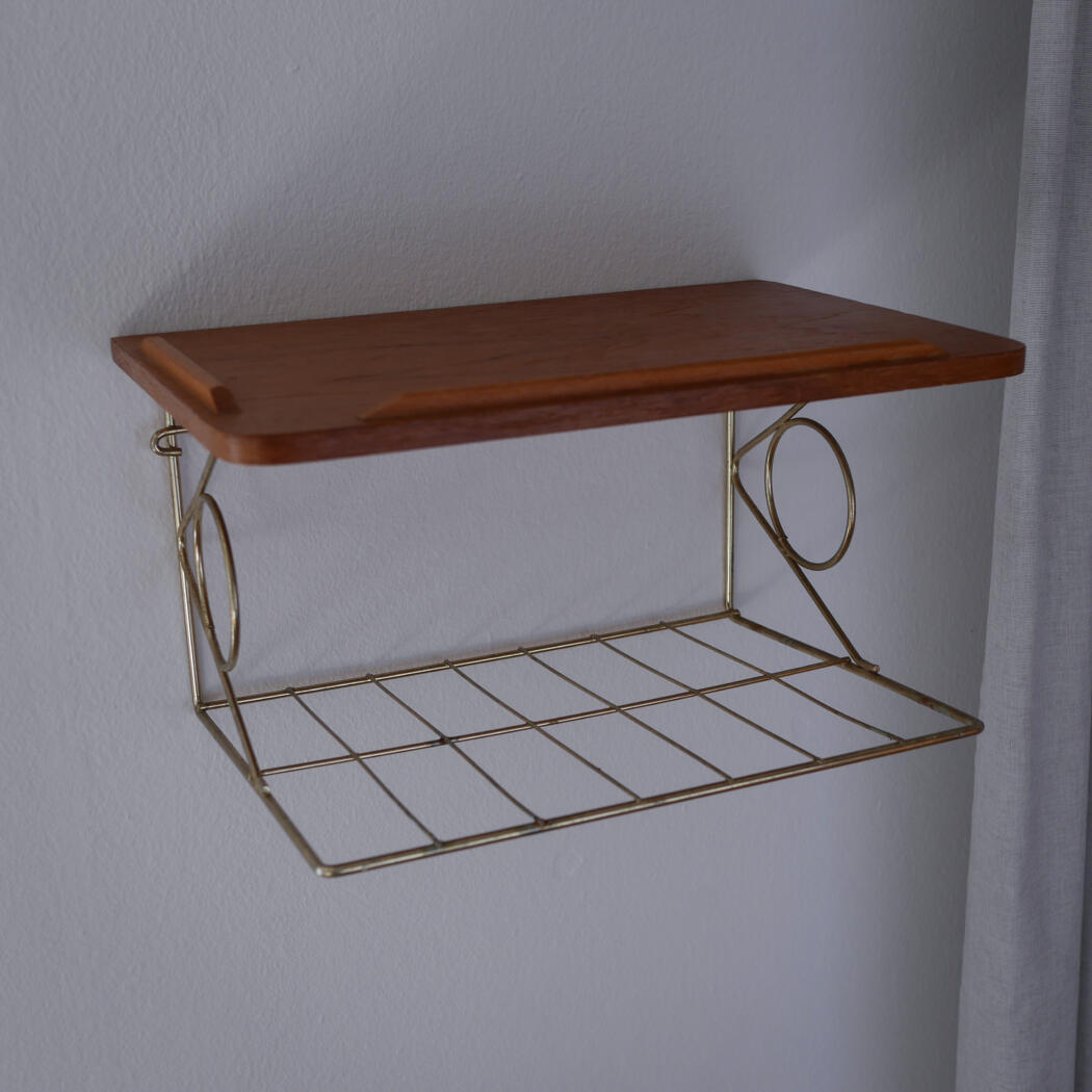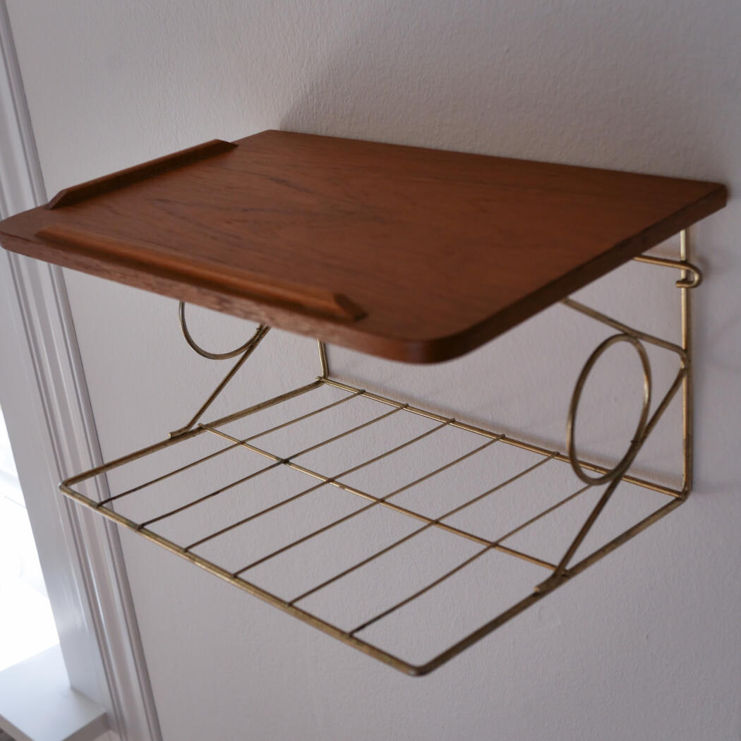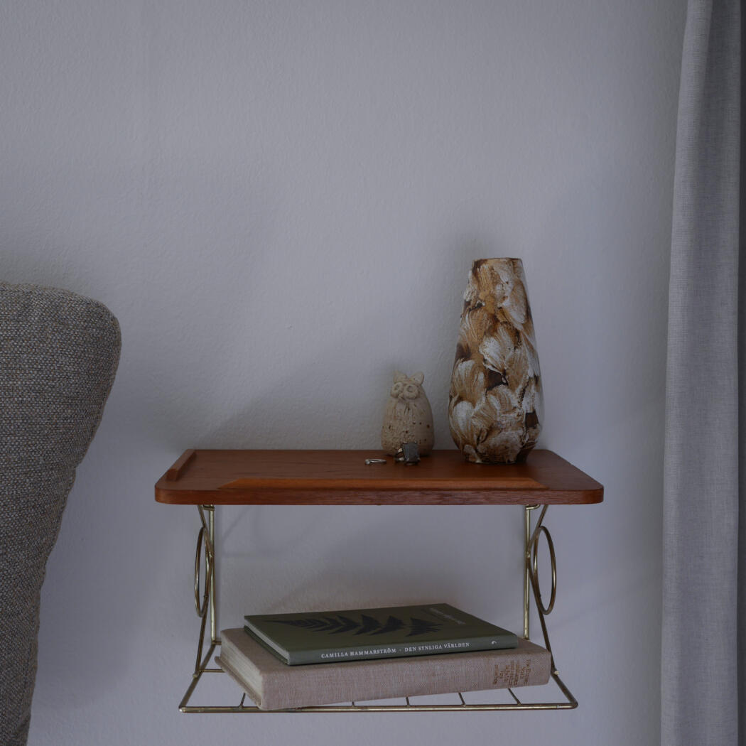 Et lille teaktræs natbord med dekorativ messinghylde, som tilfører de helt rigtig retro stil til soveværelset. Bordet har to mindre afslag, se detaljebilleder. Smuk og enkel opbevaring til ophæng på væggen. Natbordet er fundet i Sverige.