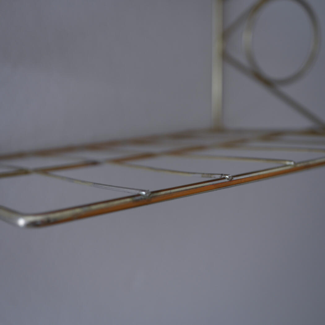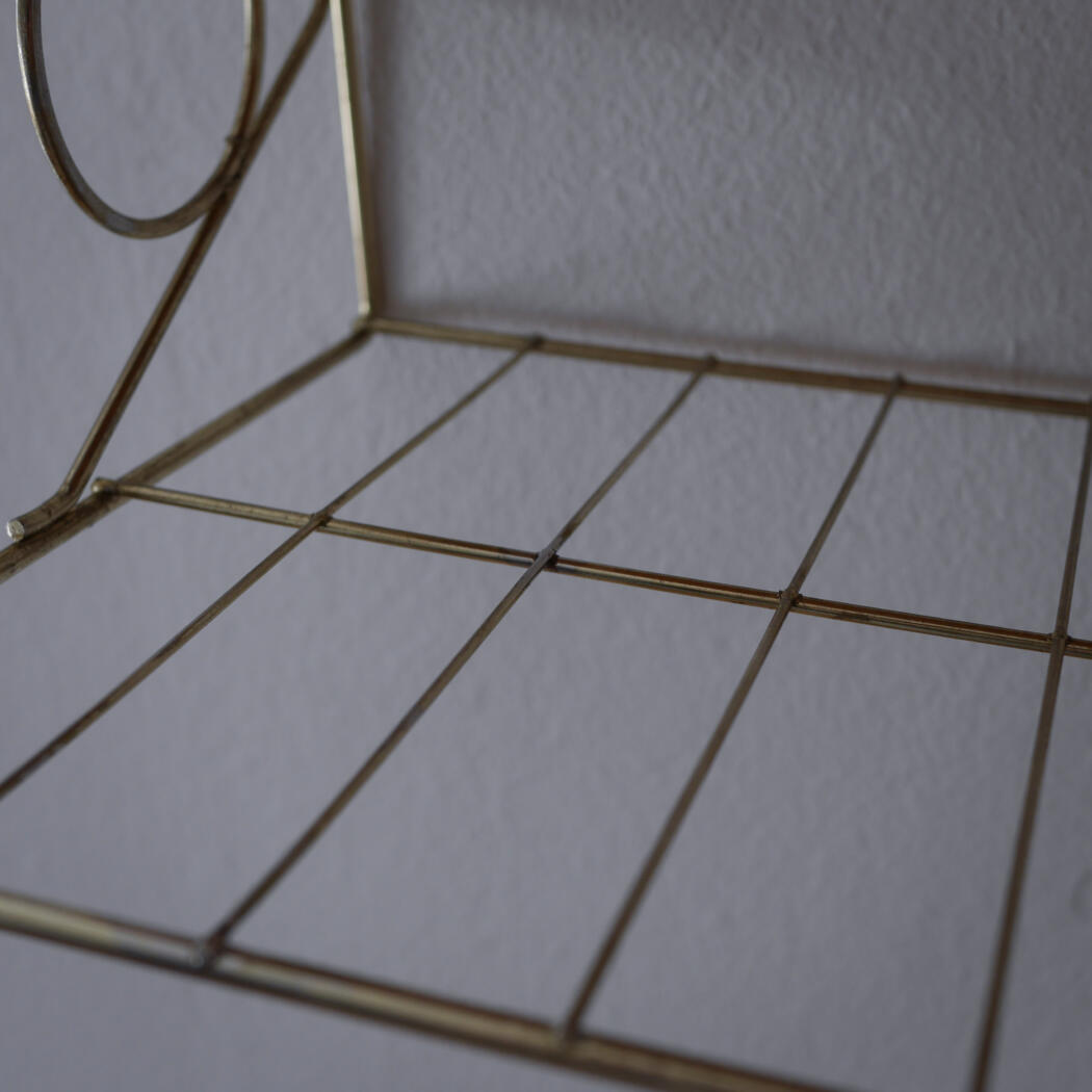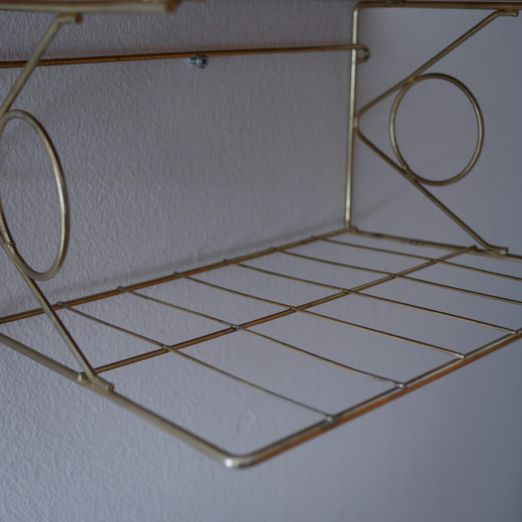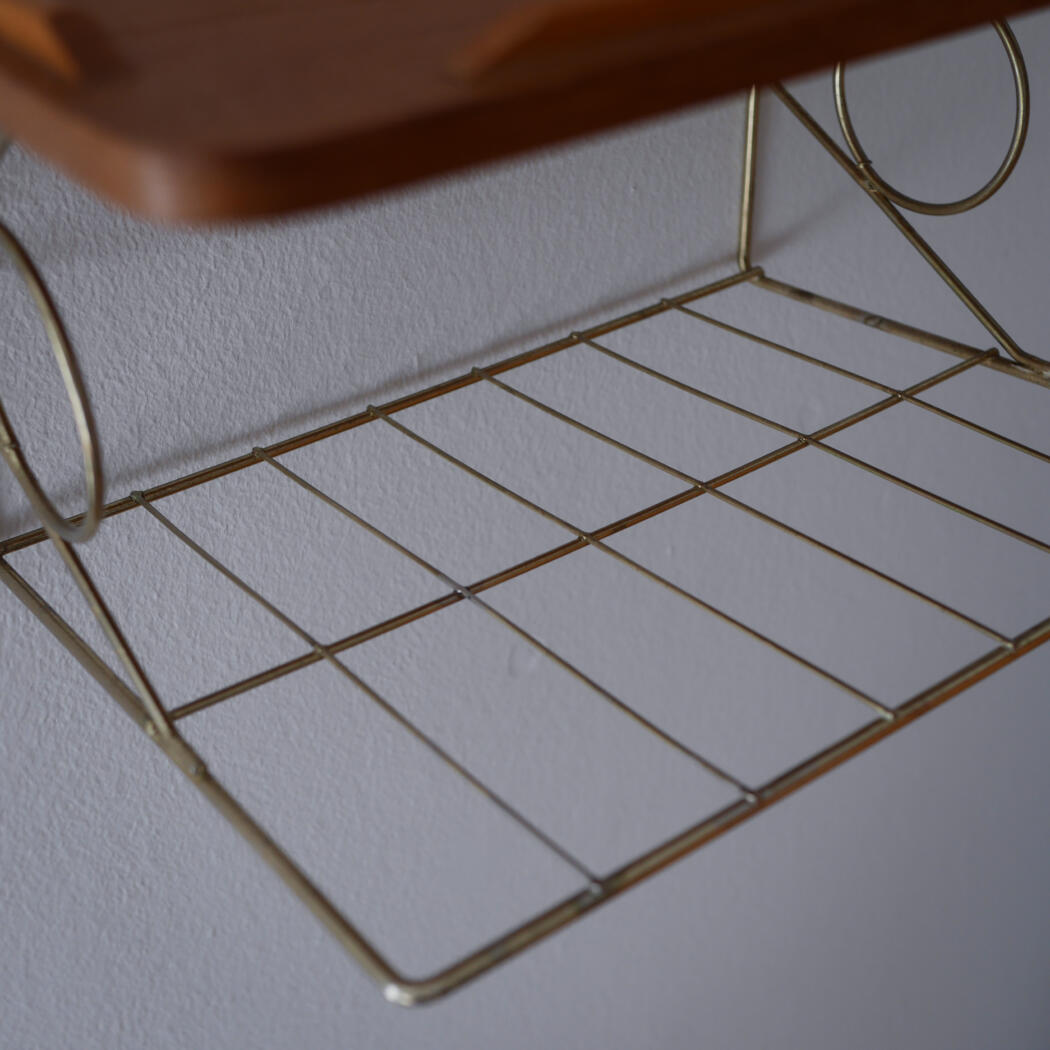 Et lille teaktræs natbord med dekorativ messinghylde, som tilfører de helt rigtig retro stil til soveværelset. Bordet har to mindre afslag, se detaljebilleder. Smuk og enkel opbevaring til ophæng på væggen. Natbordet er fundet i Sverige.