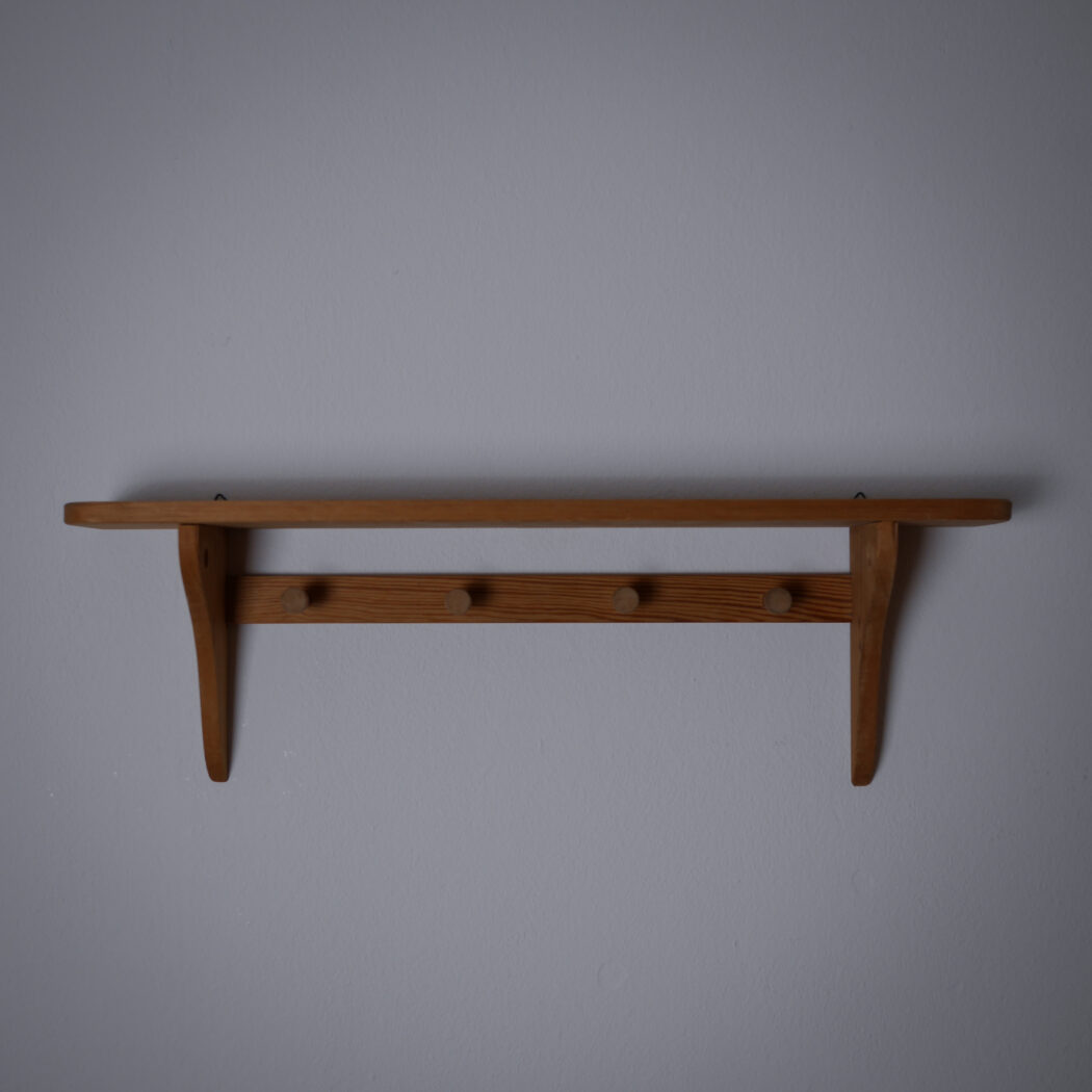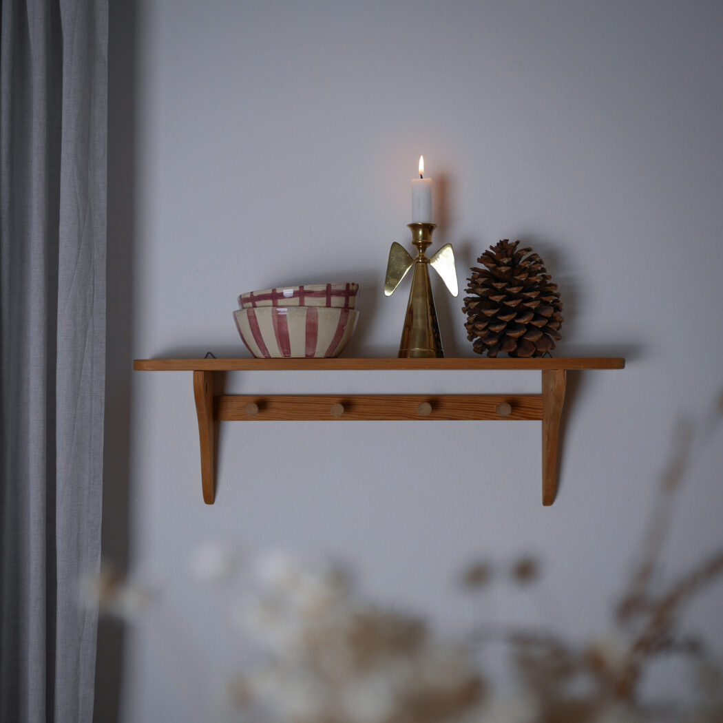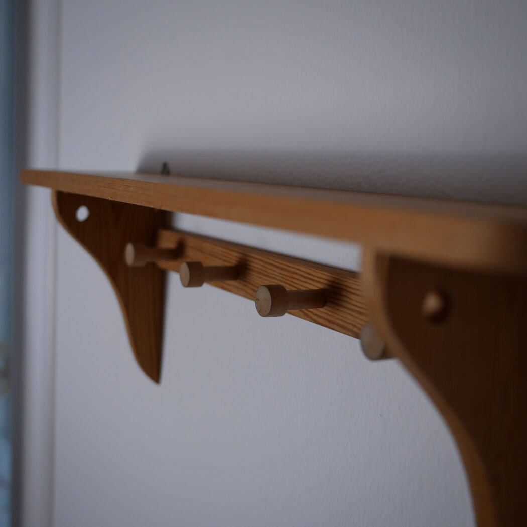 En skøn lille træ hylde med knagerække under perfekt til let opbevaring. Træ i inderetningen er super aktuelt, det giver et let og enkelt udtryk. Denne træhylde er fundet i Sverige.