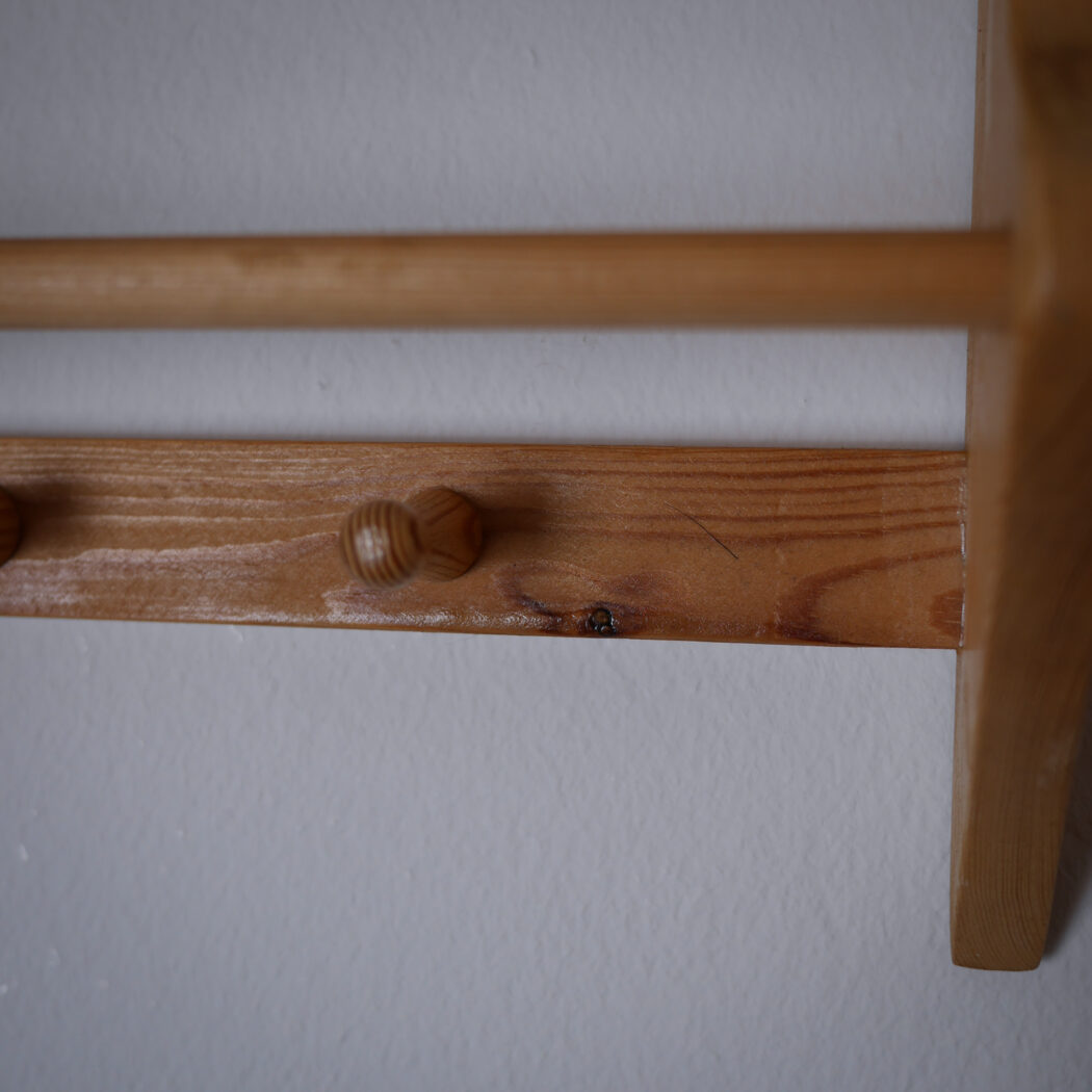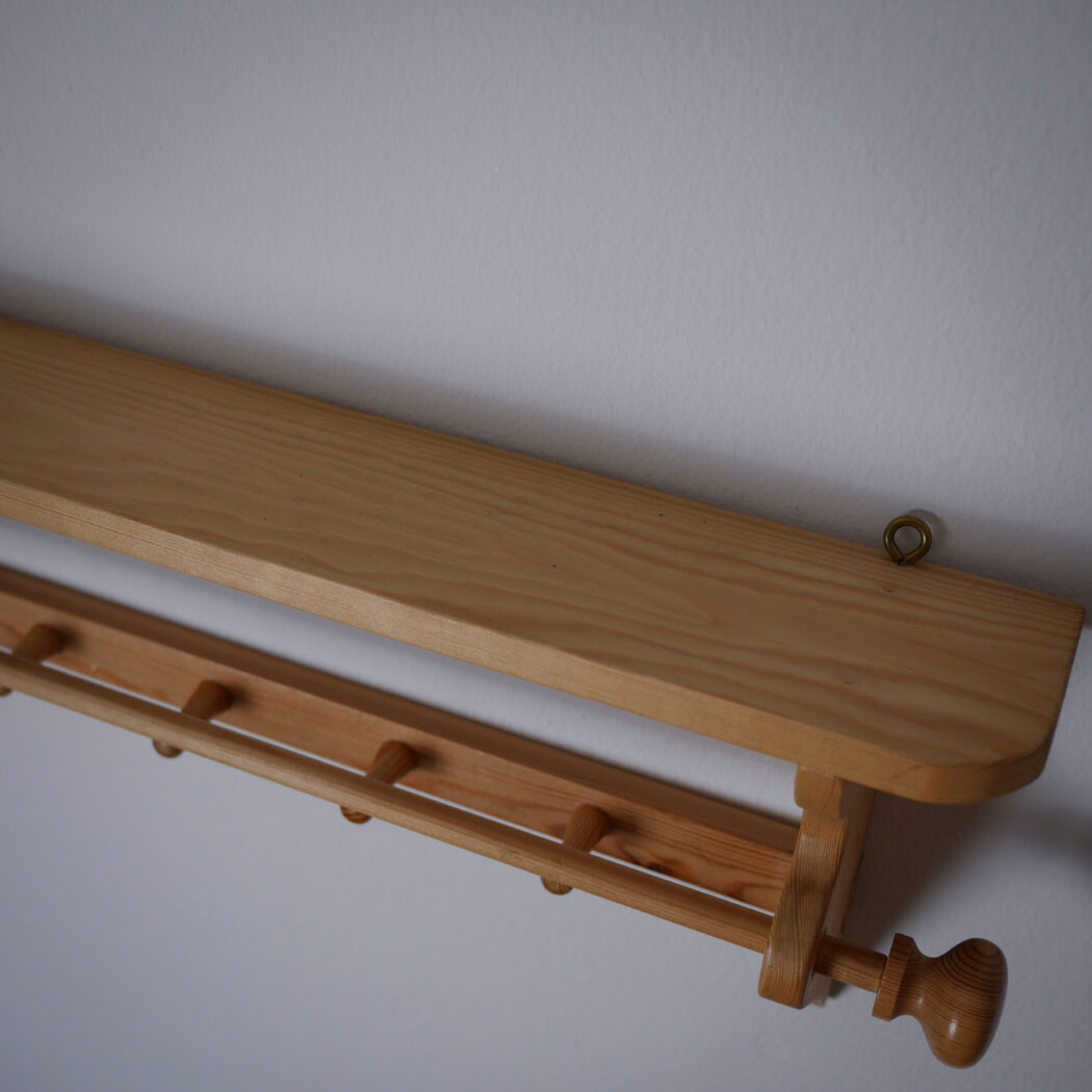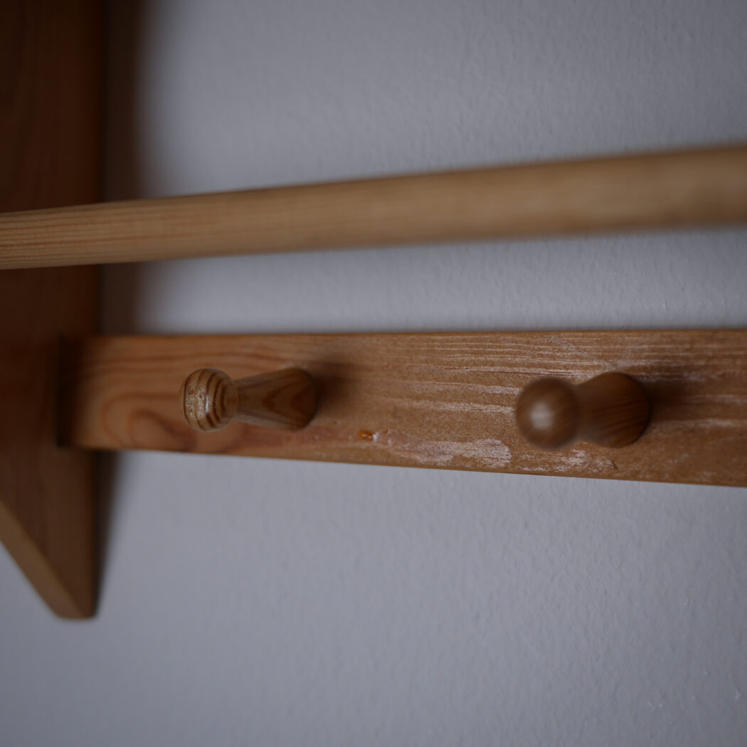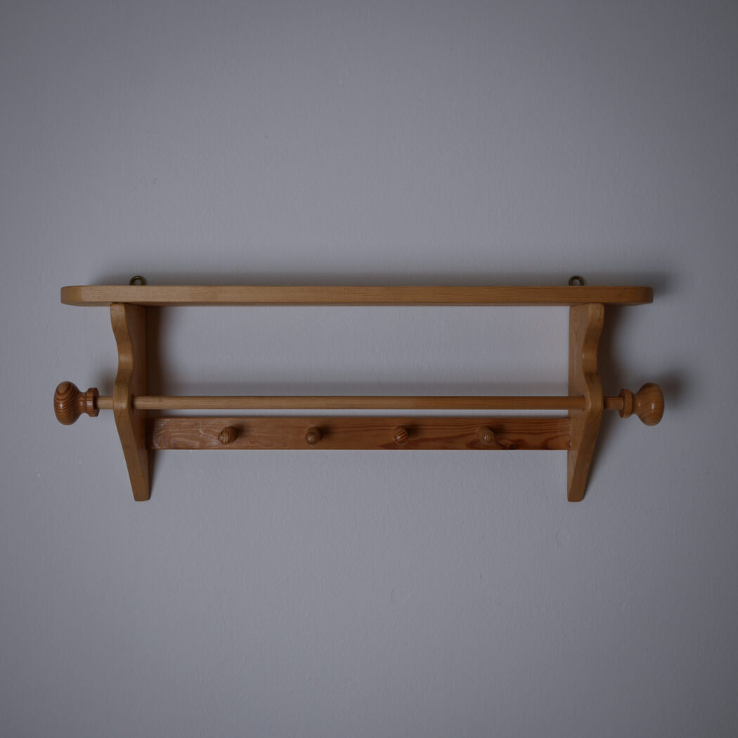 En flot lys træhylde til væggen med fire knager og en stang til opbevaring. Perfekt til badeværelset, hvor gæstehåndklædet kan hænge eller køkkenet til viskestykker. Enkel og fin opbevaring – et fund fra Sverige.