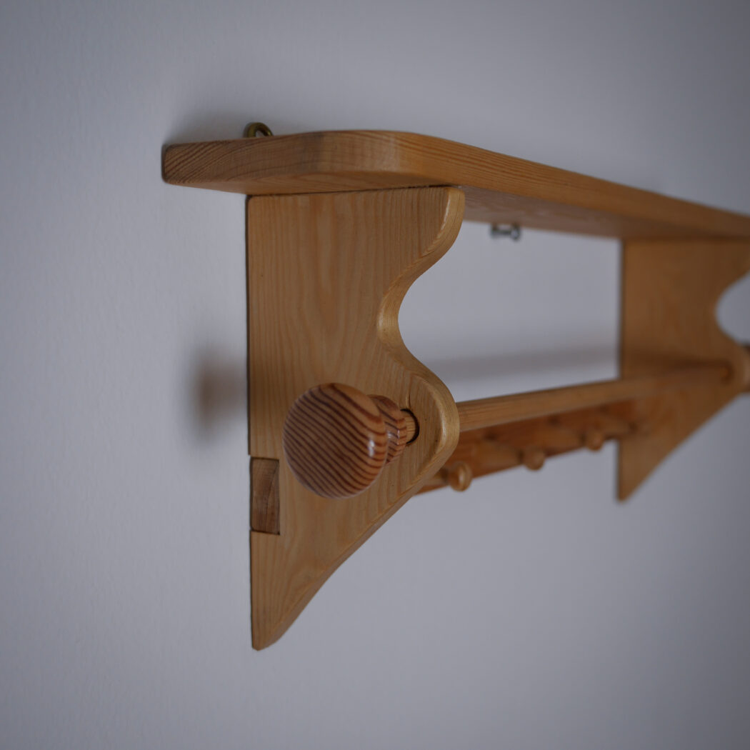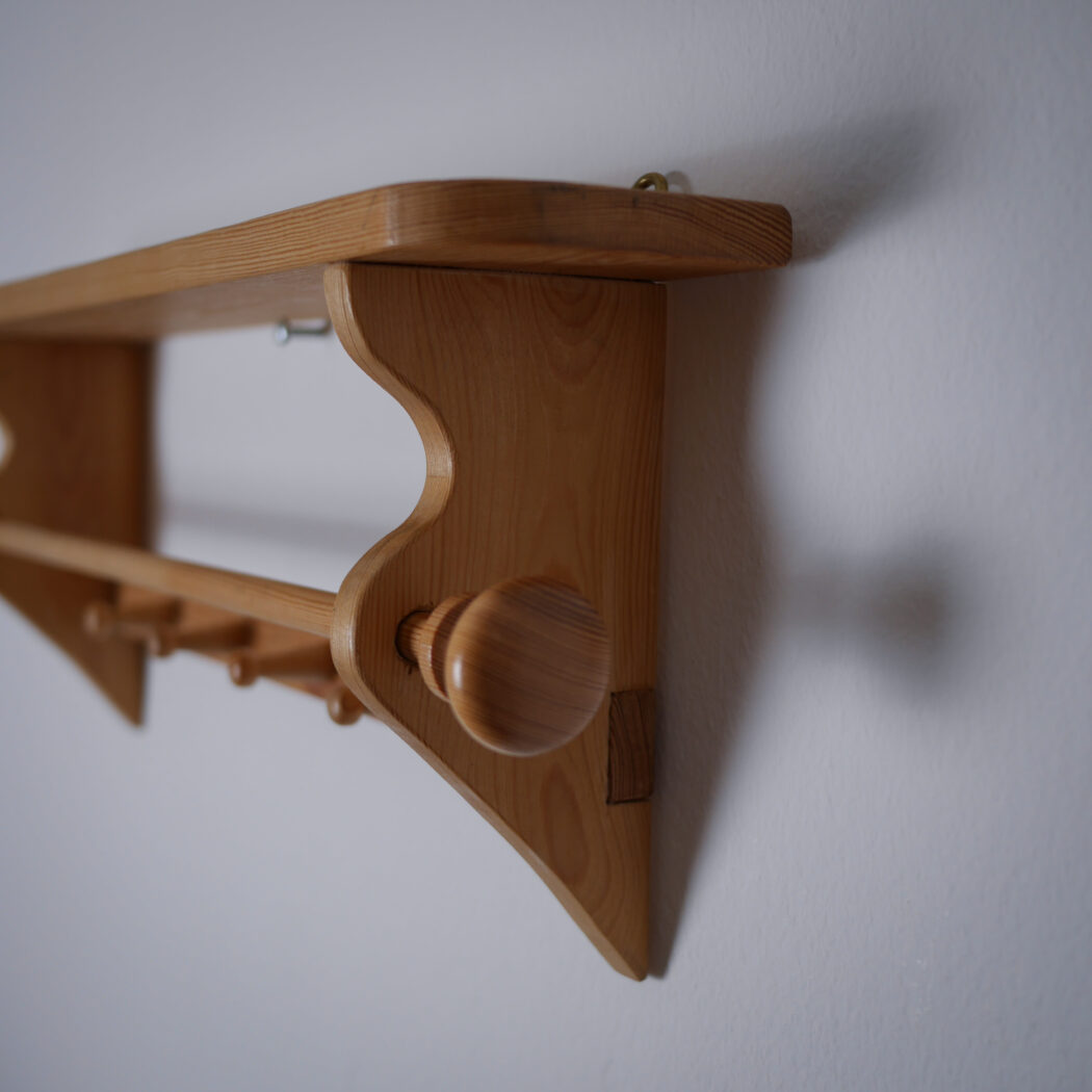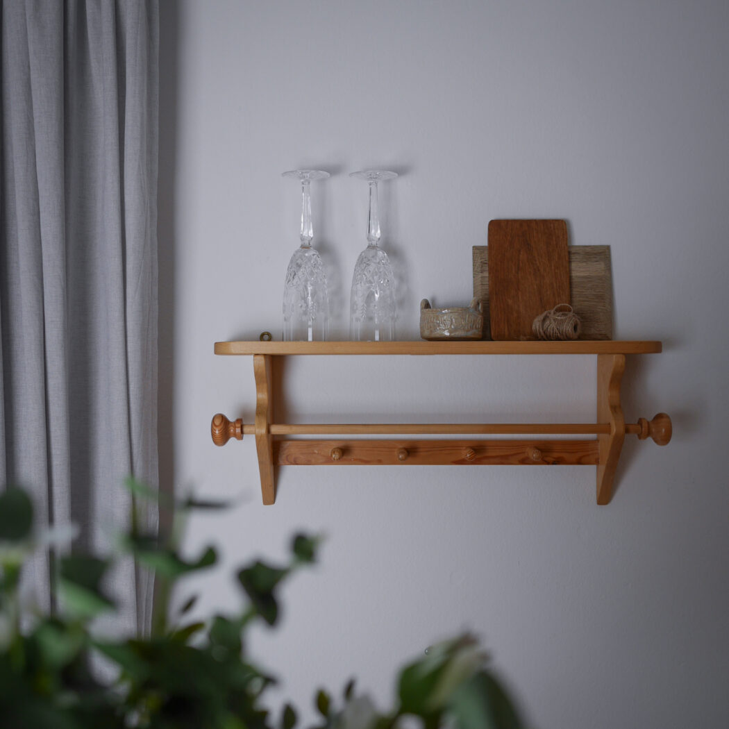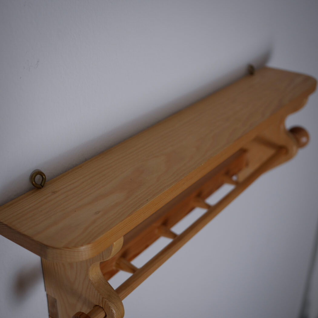 En flot lys træhylde til væggen med fire knager og en stang til opbevaring. Perfekt til badeværelset, hvor gæstehåndklædet kan hænge eller køkkenet til viskestykker. Enkel og fin opbevaring – et fund fra Sverige.