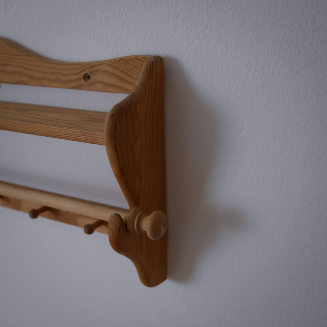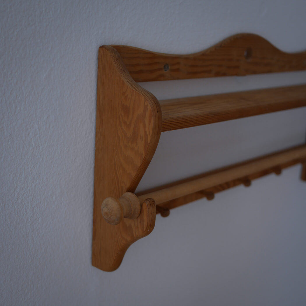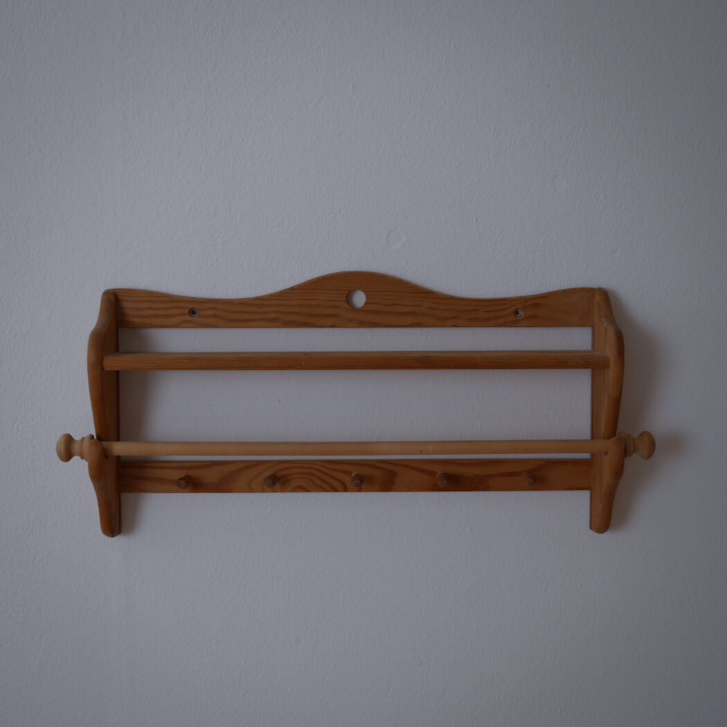 En enkel og fin træhylde med fem knager og en stang til at hænge et viskestykke eller lille håndklæde på. Fin i køkkenet eller på badeværelset – måske i sommerhuset. Et fund fra Sverige.
