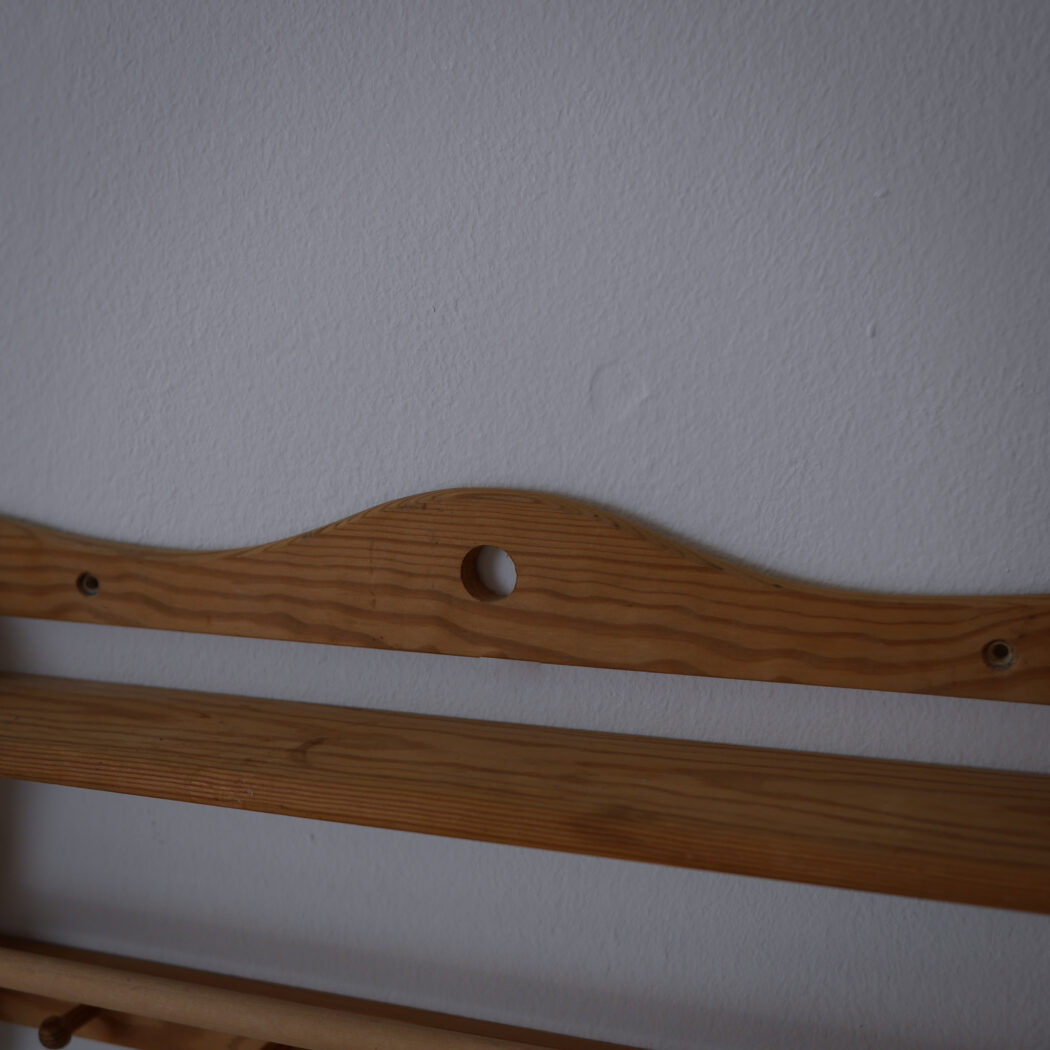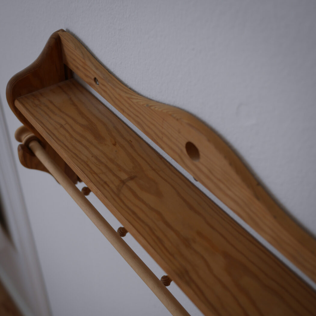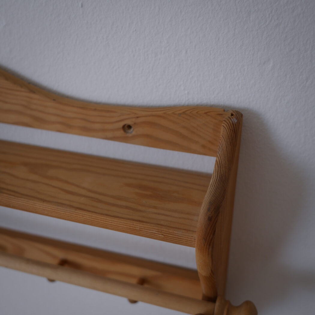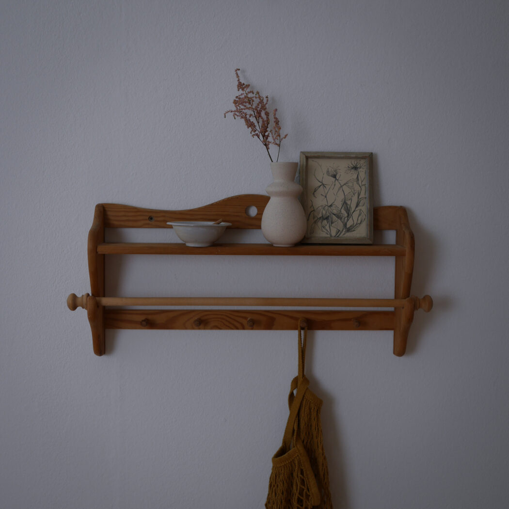 En enkel og fin træhylde med fem knager og en stang til at hænge et viskestykke eller lille håndklæde på. Fin i køkkenet eller på badeværelset – måske i sommerhuset. Et fund fra Sverige.