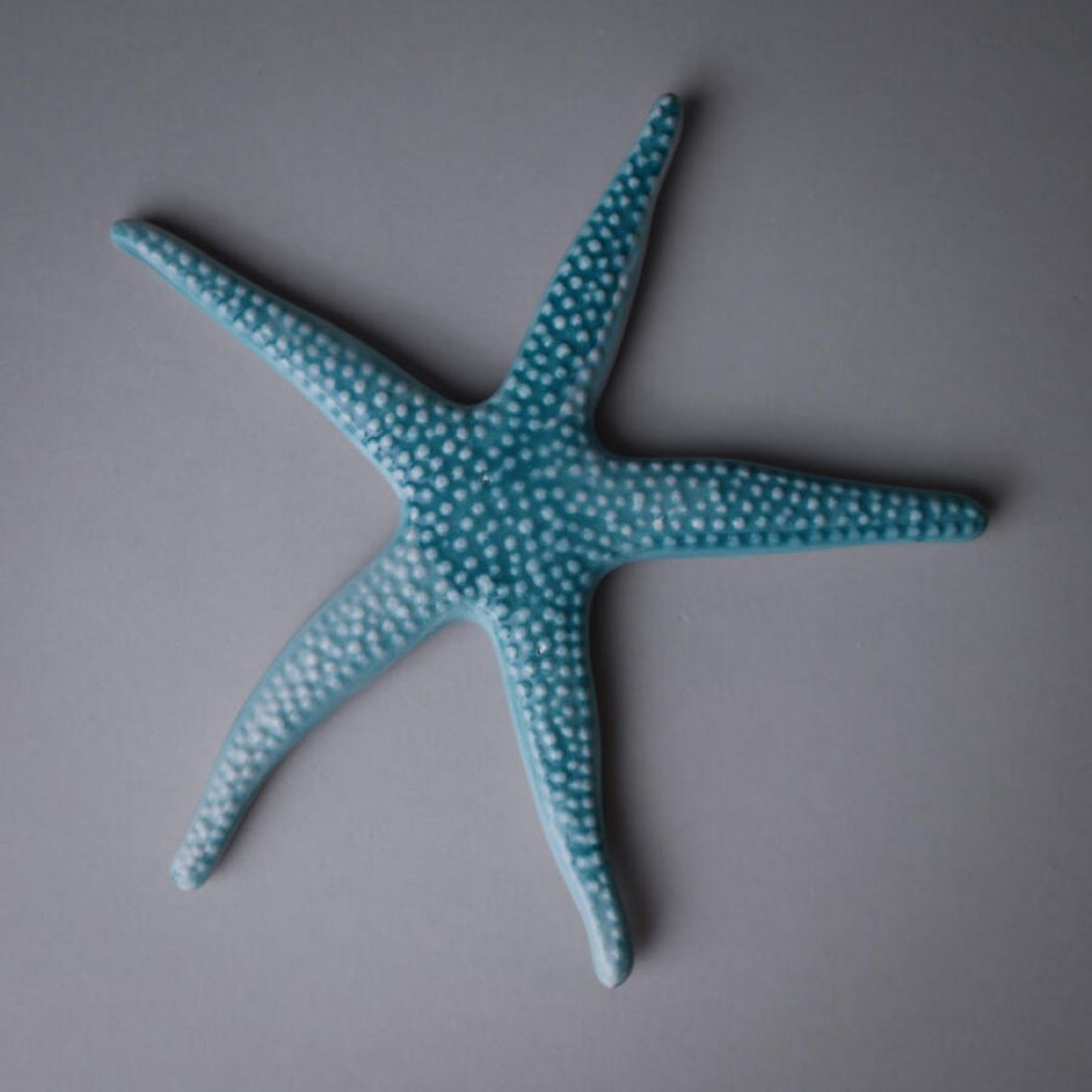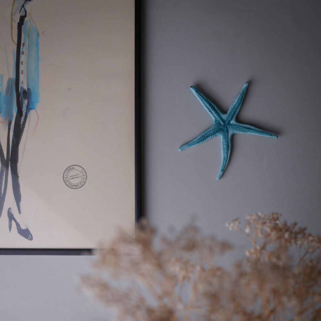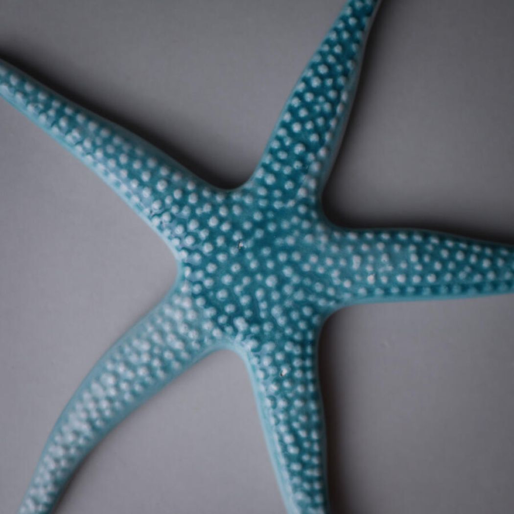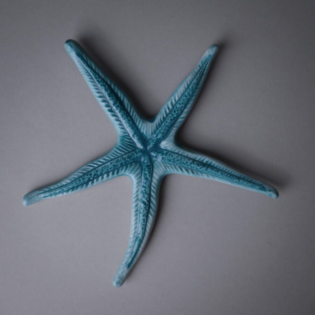 En fantastisk fin turkis søstjerne fra Italien med et flot farvespil. Den kan vendes begge veje, og vil pynte noget så smukt på væggen. Søstjernen er i porcelæn, og den er fundet i Italien. Vægophæng medfølger.