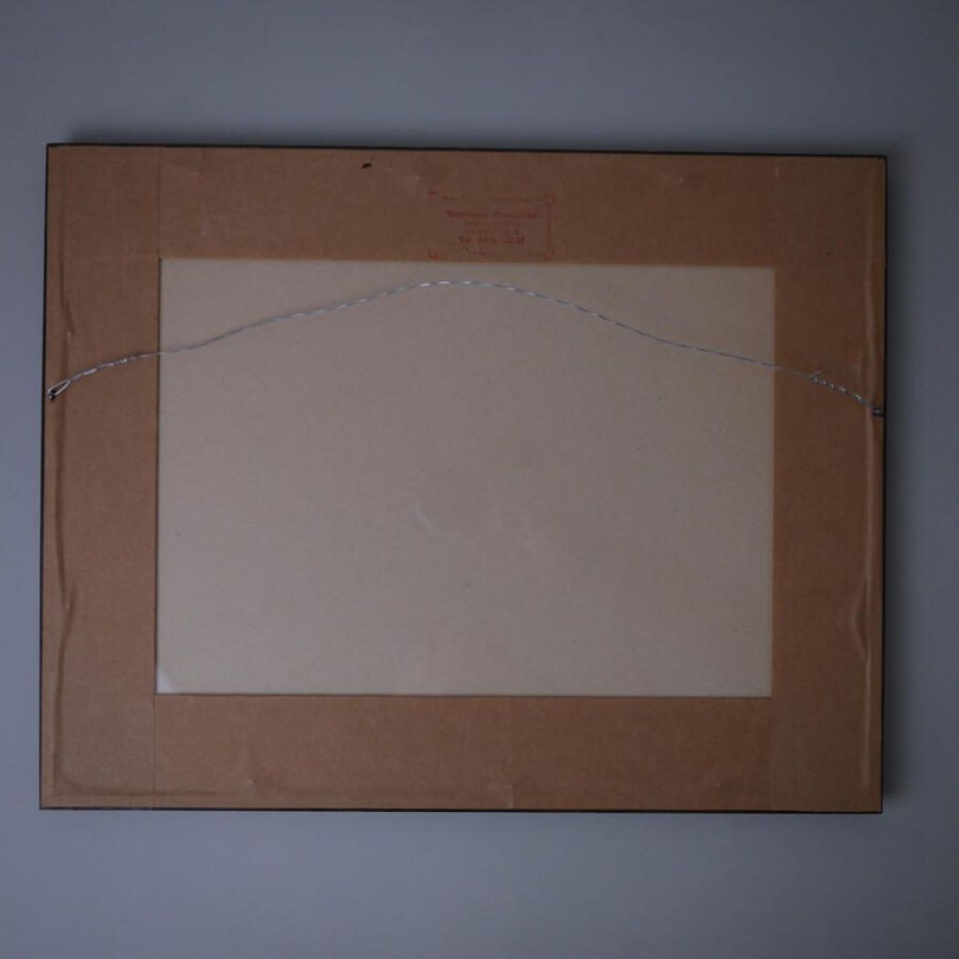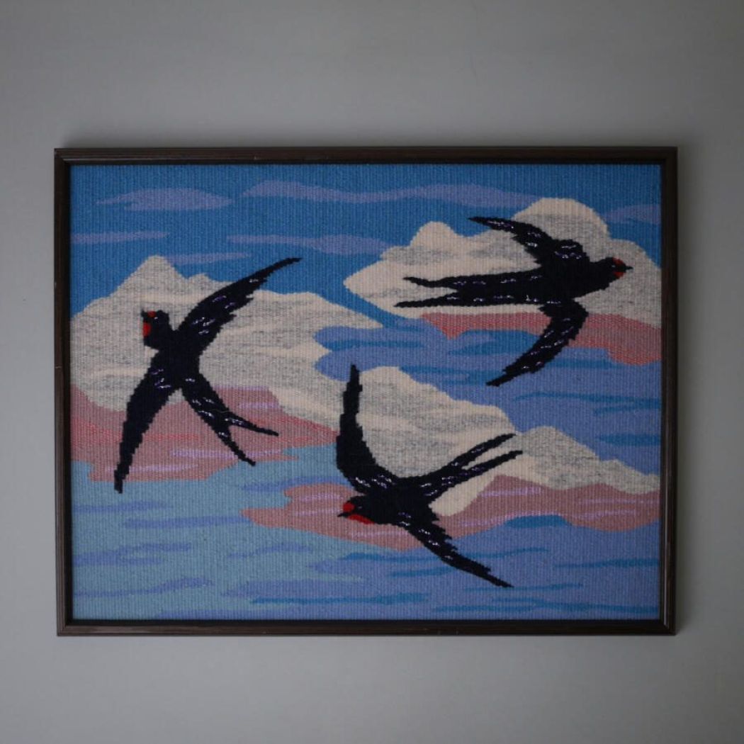 Et smukt vævet pastelbillede med svaler i en mørk træramme. Et unikt håndlavet billede til væggen i flotte farver. Billedet er fundet i Sverige.