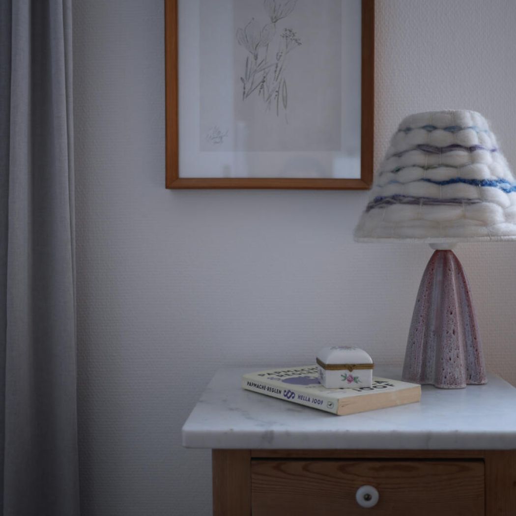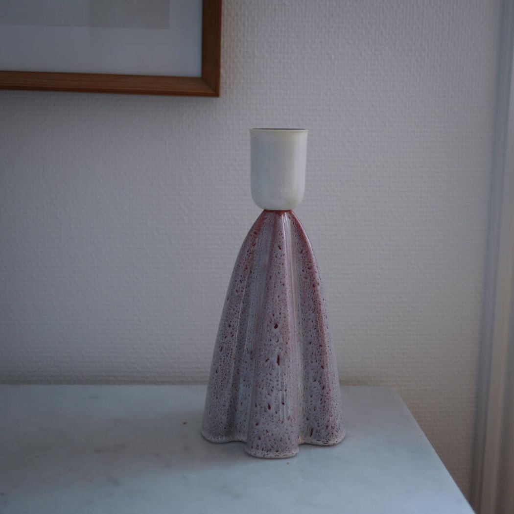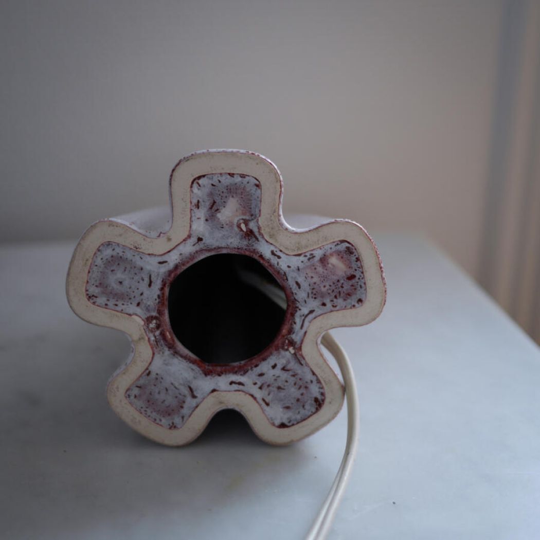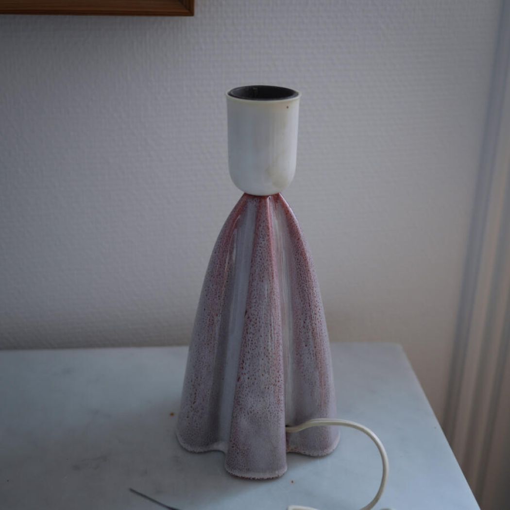 En smuk rød og hvid vintage lampe i keramik i en dekorativ udformning. Det er svært at beskrive dens smukke farver, men det er en hvid lampe med rødlige strukturer og prikker i glasuren – en let og elegant lampe! Et fund fra Sverige. Skærme sælges seperat. Obs. stor fatning.