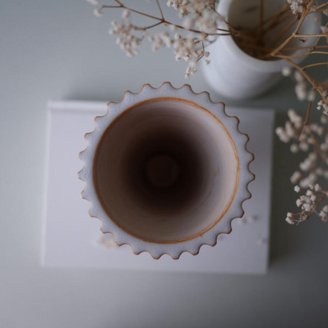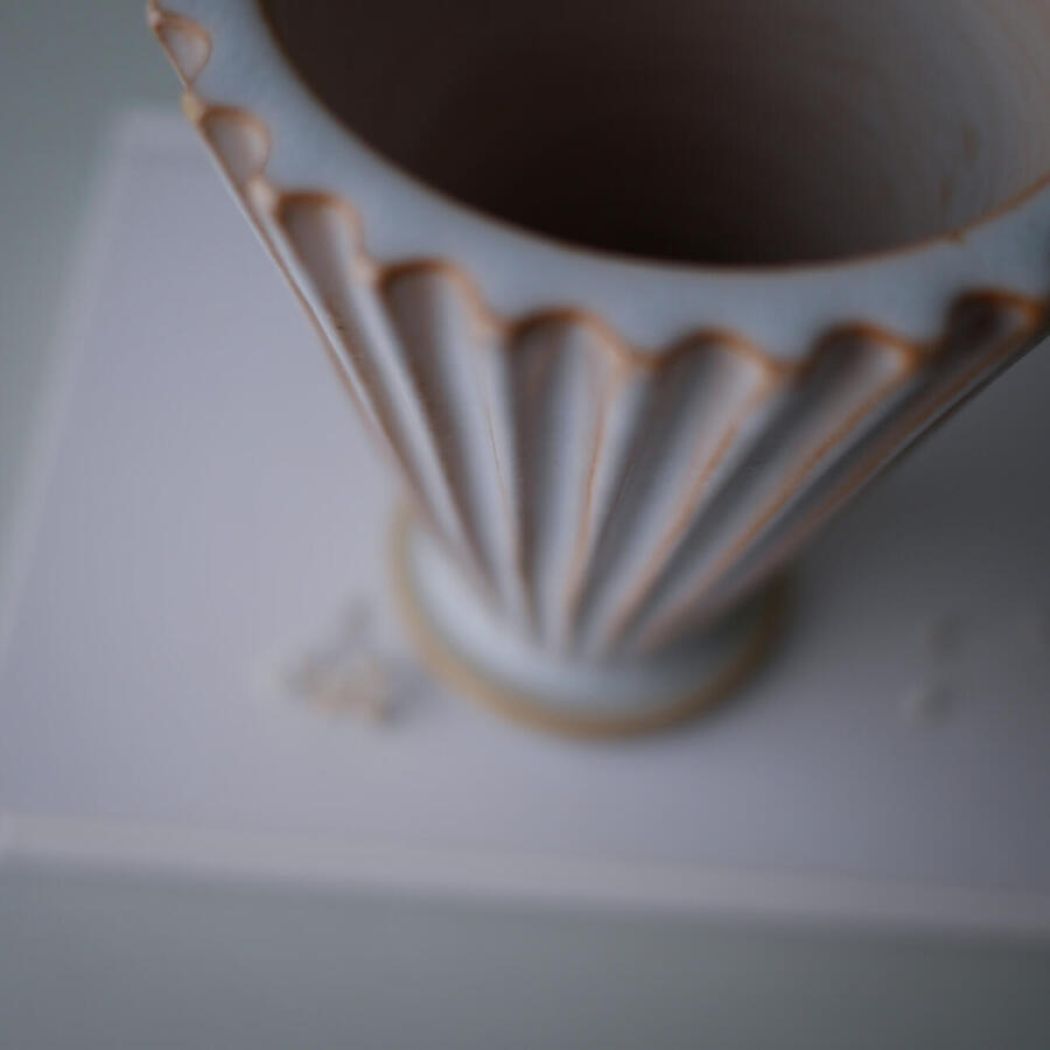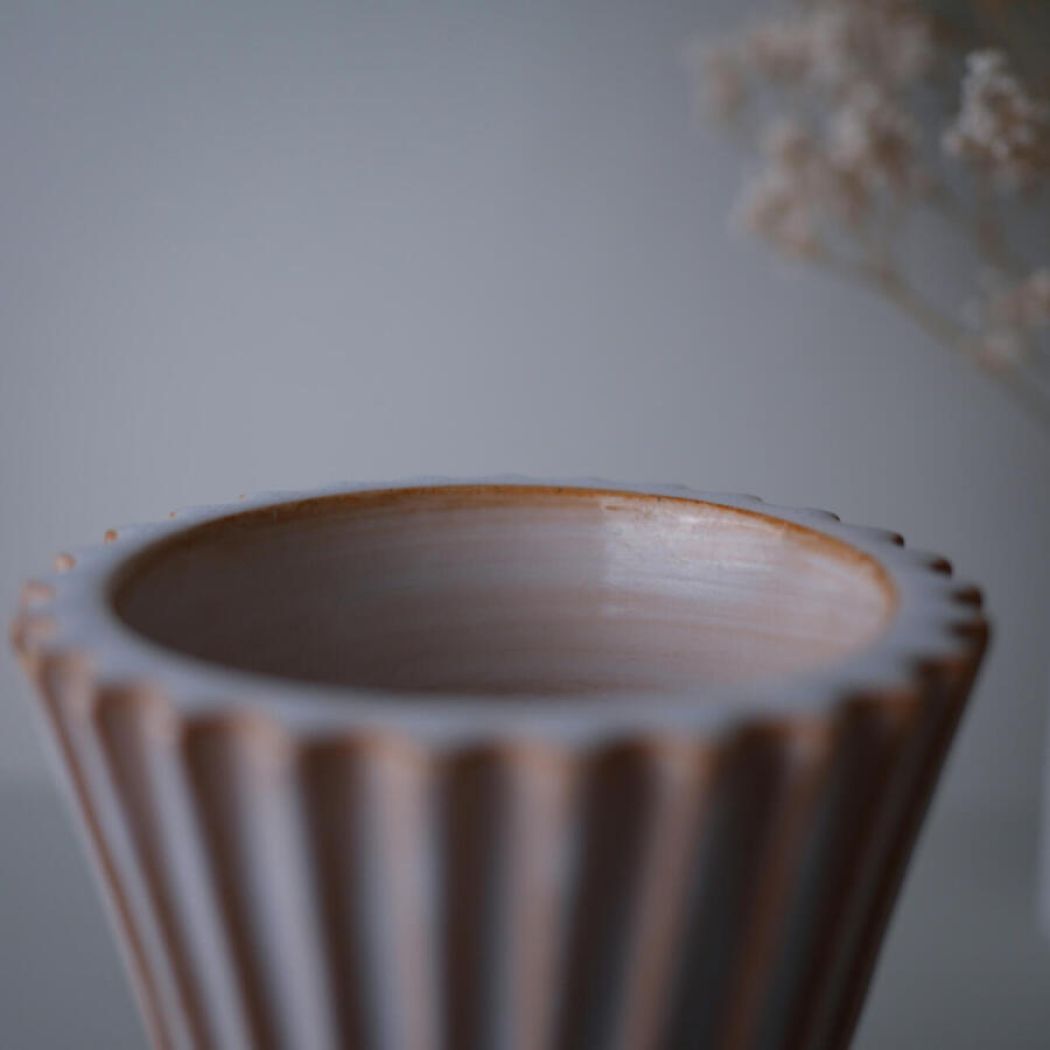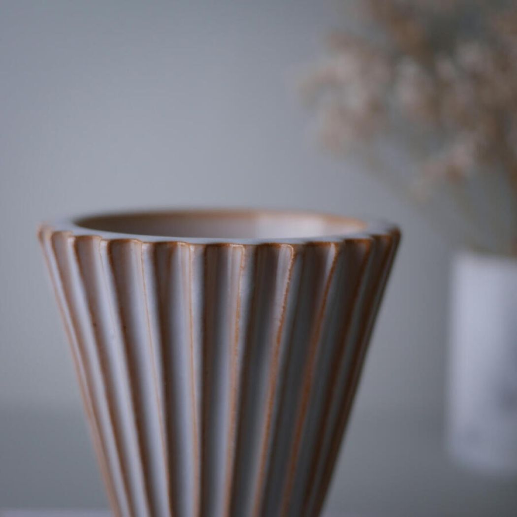 Et sjældent og meget meget fint fund – en lys rillet vintage vase fra Schollert Keramik. En smuk vase, som er et kunstværk i sig selv. De smukke riller og den lyse keramik gør den perfekt, som en del indretningen. Vasen er i perfekt stand, det er virkelig et sjældent og meget smukt fund!